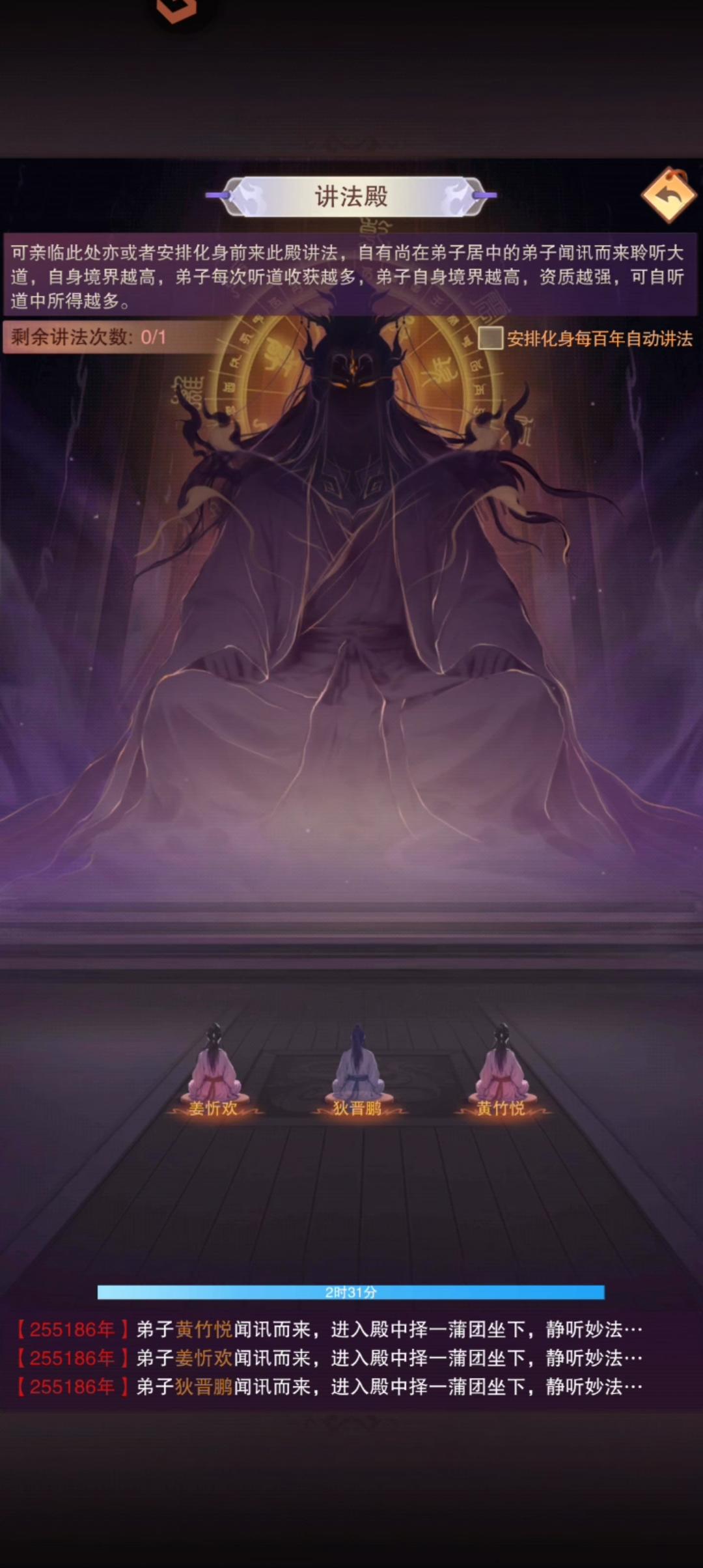 每天可以在讲法殿进行一次讲法,第一次讲法要在收弟子后手动进行,可别在还没弟子的时候就勾选自动讲法。