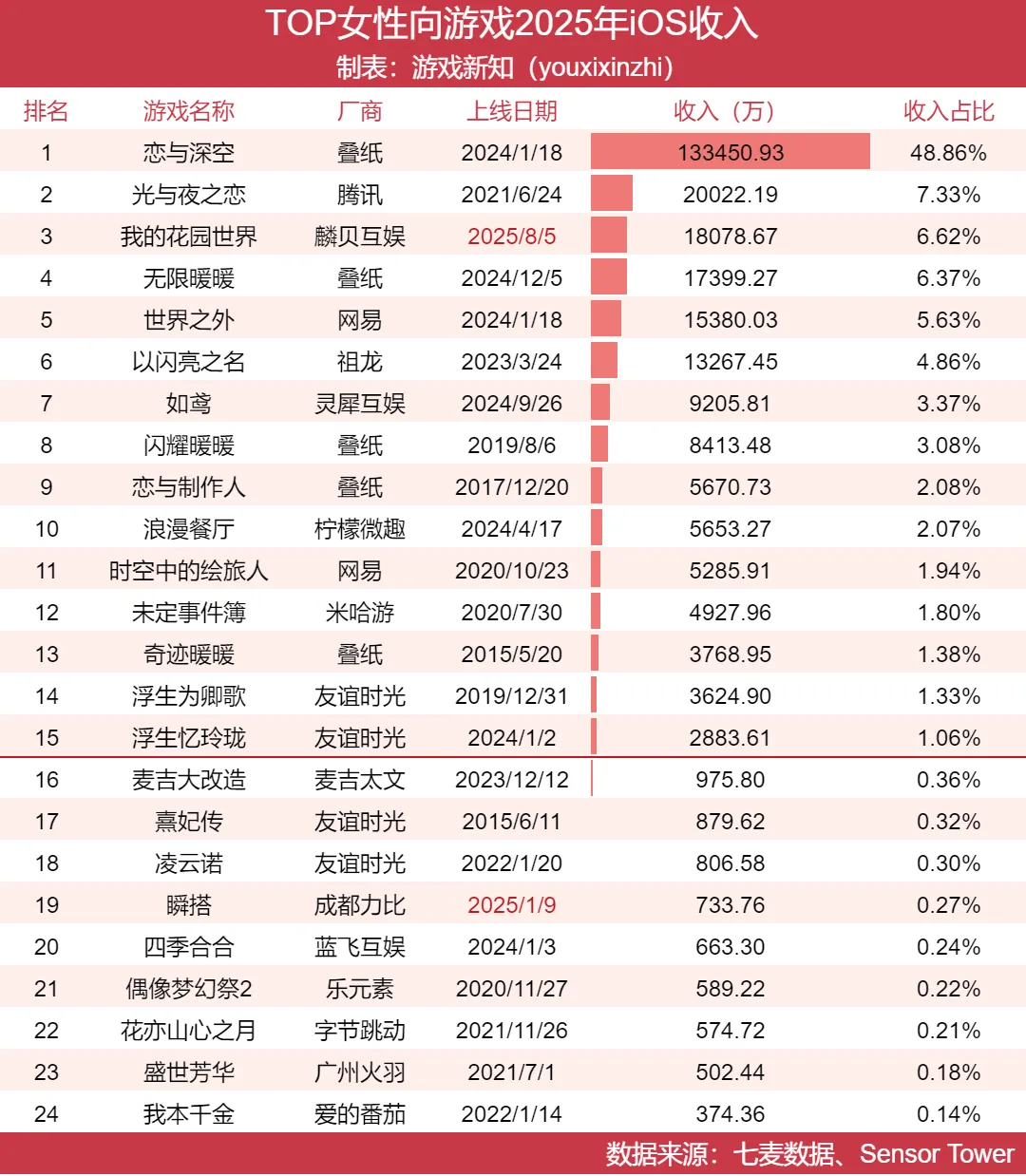 1月22日消息,知名游戏媒体【游戏新知】发布公众号文章《2025女性向市场:<恋与深空>一骑绝尘,柠檬微趣统治海外》总结2025年女性向市场状况,《恋与深空》在iOS畅销榜TOP600收入占比过半。