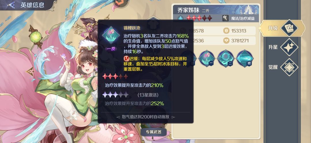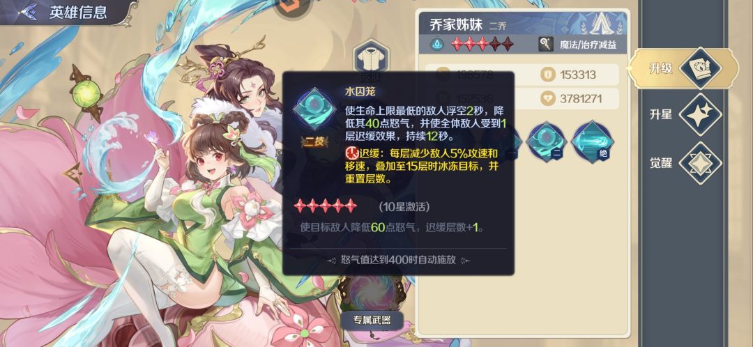 她的二技能是可以弹射三次队友来进行回血的 这个是完全不固定的 不知道哪个队友会吃到这个治疗效果和另外一个水系奶妈相比这个技能比较鸡肋……因为第二个水系奶妈二乔她不仅可以恢复三名队友的生命值并且还可以回复怒气另外可以叠加负面效果(迟缓)当然她的厉害之处是在于一技能和三技能(绝招)