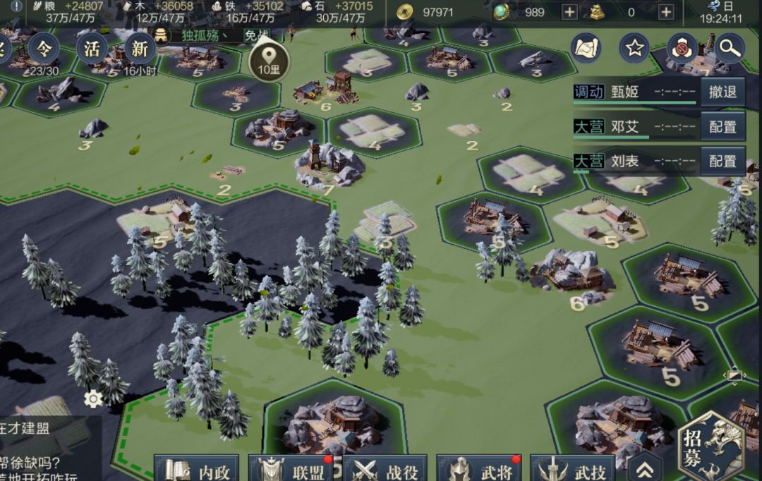 下面我就说一下打地的小技巧吧,想必玩过的小伙伴都知道,新手期消耗只有8点体力就能打块地,我们有很多将,我们可以分好几个军团打地,等级低的军团打低级的地,往高级地附近连,然后用一军团打高级地,这样效率更高,势力值长得更快