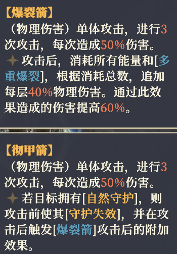 无论是爆裂箭还是彻甲箭,都会在攻击后消耗全部的爆裂层数进行追加攻击,此攻击每发单独结算,即可以最高连续触发十六次背击打出高额伤害的同时回复大量战术点(也可以在力量认证7里疯狂给怪回血救死扶伤)。安娜对于战术点的贡献能力已经持平了莎娜姿,如果露西亚的航迹boss依旧是可背击的小体型怪的话安娜有可能凭借此绝活进入冠军阵容。考虑到无论是战术点回复机制还是航迹排行榜对于99%的玩家来说都已过于深邃,在此不再详细讨论此技能。