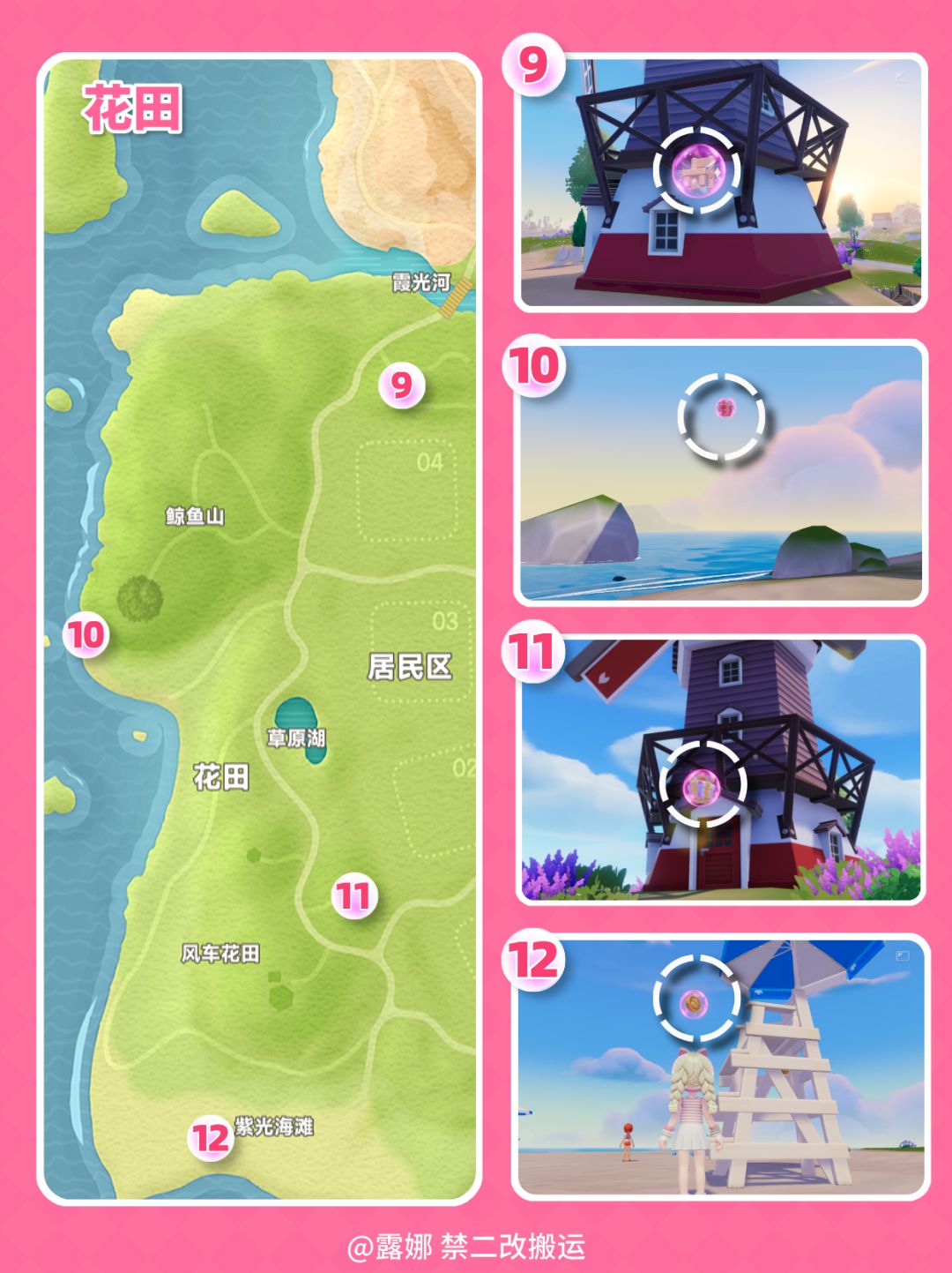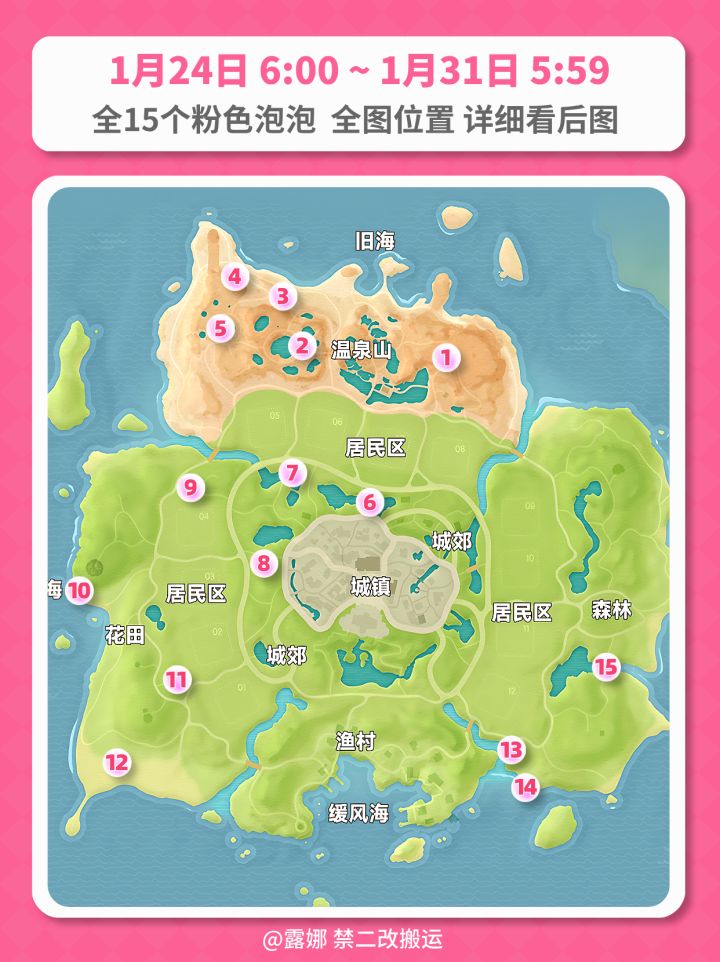 粉色泡泡规则 1、每周每人可拿1次 2、每周六早6点刷新,1月31日 早5点59分刷新位置 3、每个人的粉泡内含的物品不同 4、粉泡内的物品随机:粉色卫浴家具(非必出),满愿星等 ALL Pink bubbles Locations Guide Locations will reset at 5:59AM Jan 31 (UTC+8)