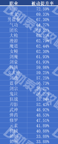 下面我们来看下全职业被动buff的提升率,辅助职业可以忽略掉,除此之外被动buff收益最高的职业则是男蓝拳,男蓝拳的主动攻击技能倍率与武神是同一水平,俩职业技能形态也比较类似,没啥太大差距,而武神的被动收益仅为48.92%,在官方未来不调整这两职业的前提下,男蓝拳的职业强度肯定是要大于武神的
