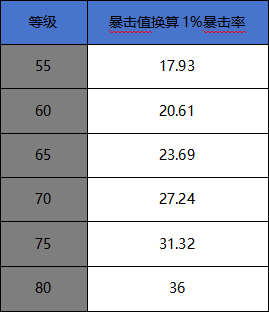 而玩家的暴击值收益则会降低,从而使得整体暴击率降低,上图就是暴击值转换暴击率的对照表,当玩家等级来到80级的时候,每36点暴击值才能提升1%的暴击率
