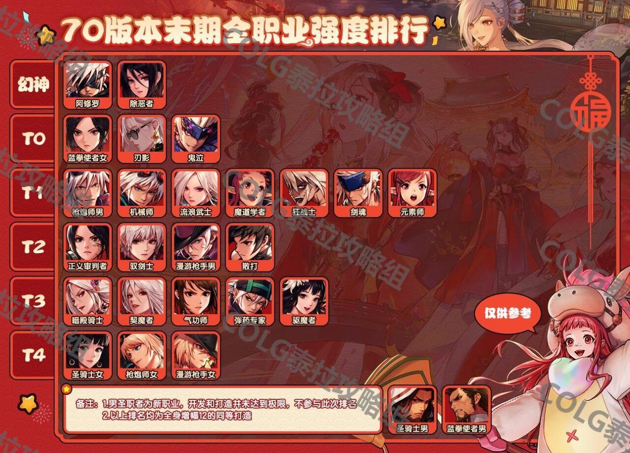 其他职业未来表现通过这个表也能推算出不少东西,比如机械师,有着最原始的buff技能,这版本全靠出色的45技能才可以走到前列,那么在下版本机械会非常难受;同理,过度依赖镇魂精炼体系的修罗、四姨、刃影、鬼泣等职业,下版本也会进入弱势期,尤其是修罗和刃影,65版本的弹药在70版本的表现就是这俩职业的缩影,已经进入“还债”倒计时了