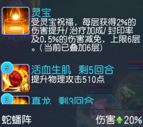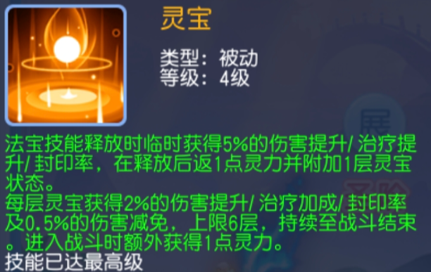 后续buff加成:每次放法宝技能,加灵宝状态,每层增2%伤害/治疗/封印率及0.5%减免,最多6层,持续到战结束。不局限于法宝,对人物有着全方位的增幅,解决了职业的关键所在,同时强化了人物的生存。