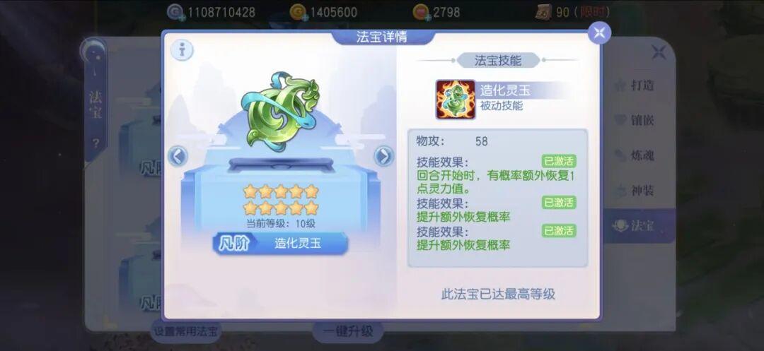 强化法宝效果:技能释放时,临时提升5%伤害/治疗/封印率。提升了法宝技能的效果,对所有的职业都有增强。