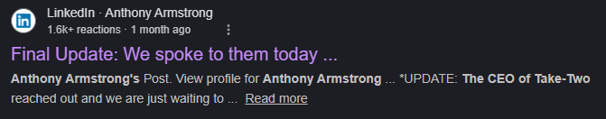 这则求助帖发布后,阿姆斯特朗随后更新了进展。他表示Take-Two(Rockstar母公司)的CEO亲自联系了他们,随后他们与Rockstar团队进行了进一步沟通。