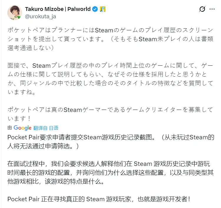 《幻兽帕鲁》的开发商Pocketpair近日公开了其招聘流程中的一项特定要求。公司首席执行官沟部拓郎表示,应聘者需提交个人Steam账户的游戏游玩历史截图,没有Steam游玩记录的申请人将无法通过初步筛选(如图二)。
