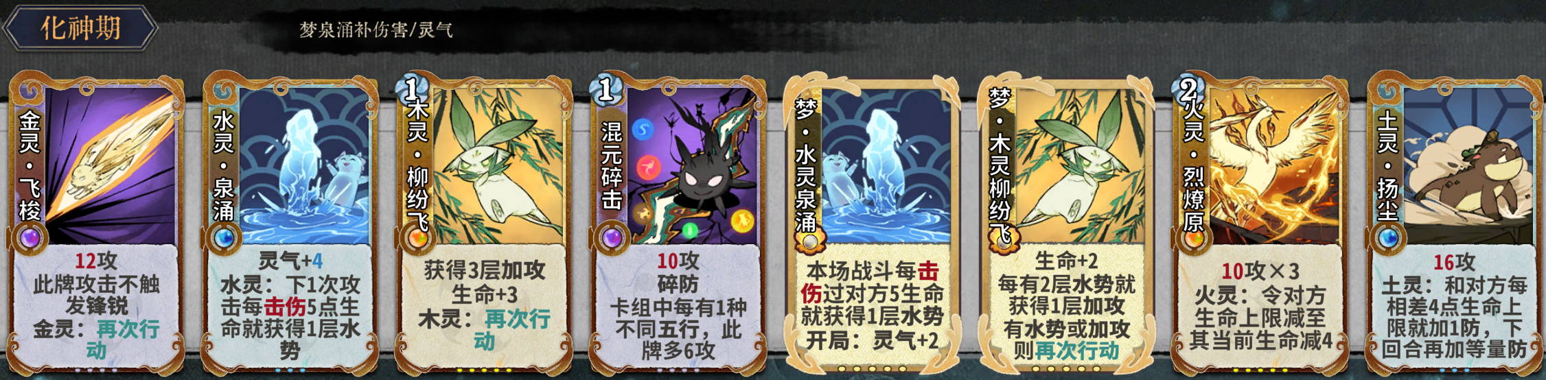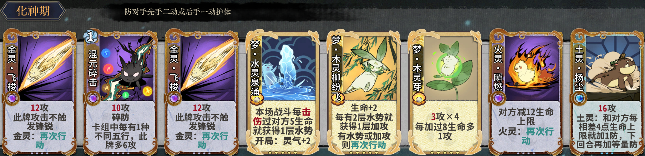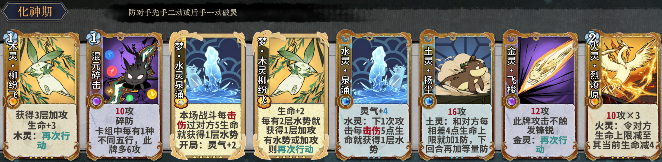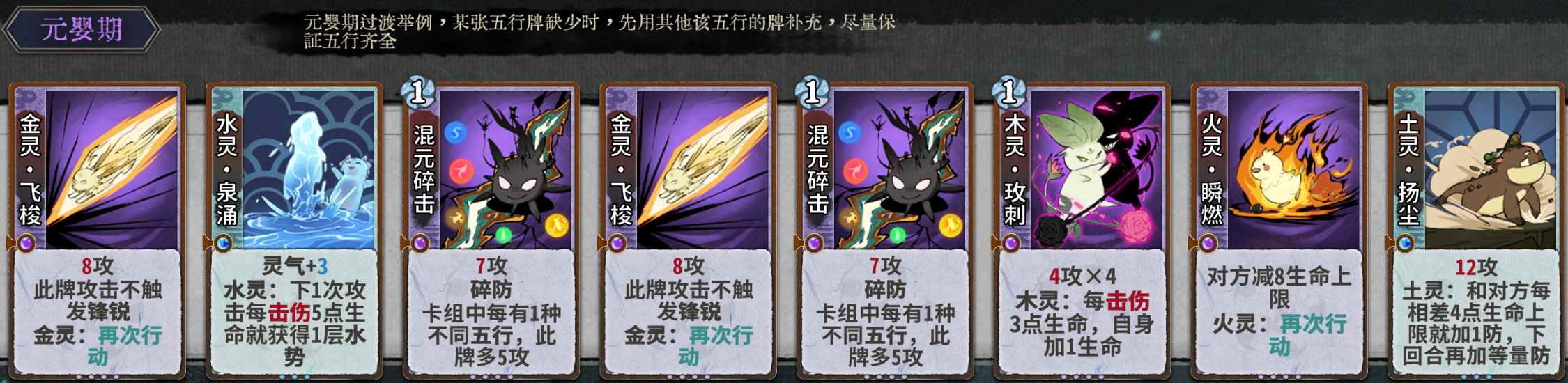 元婴期关键牌:水灵泉涌、混元碎击、木灵玫刺、火灵瞬燃、土灵扬尘、金灵飞梭、金灵铁骨。