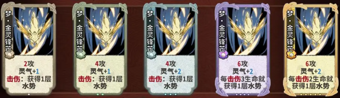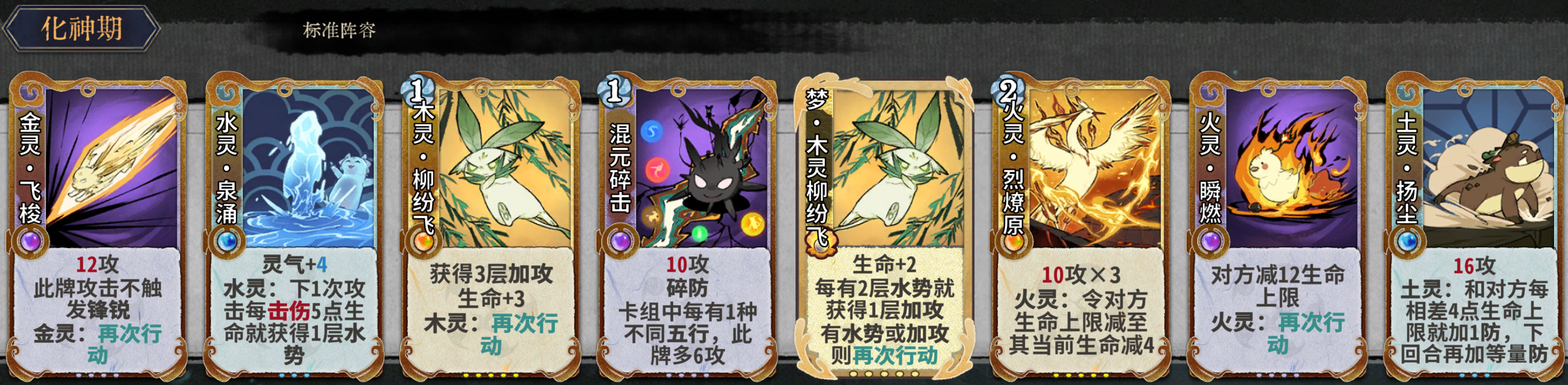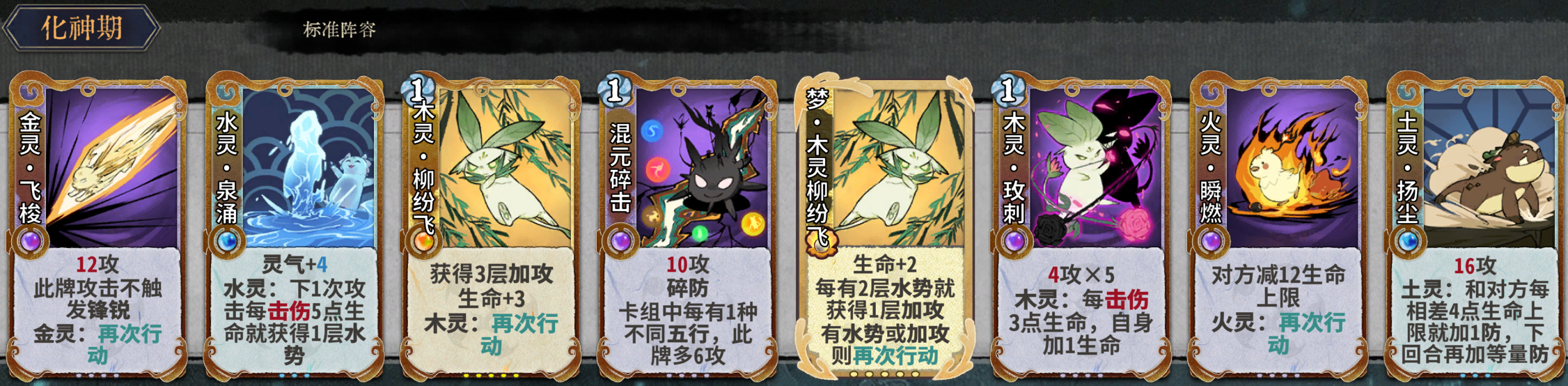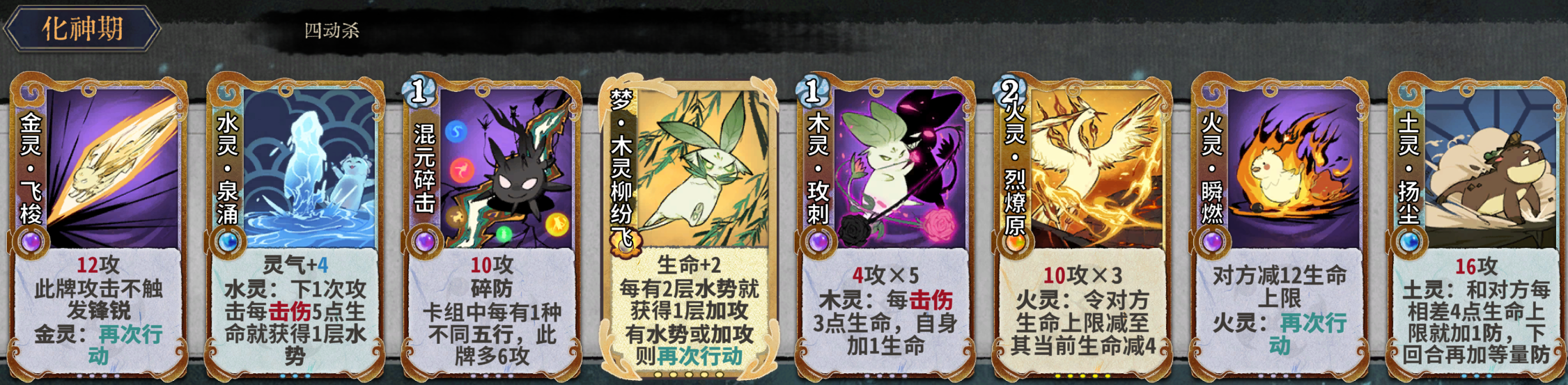 元婴期关键牌:水灵泉涌、混元碎击、木灵玫刺、火灵瞬燃、土灵扬尘、金灵飞梭、金灵铁骨。