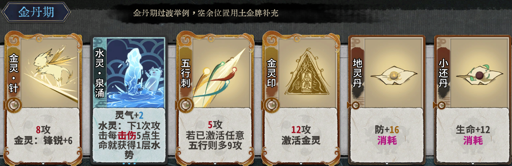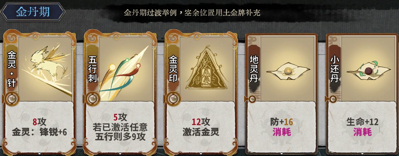 第5轮直接多炼化牌从炼气期连续突破至金丹期,牌仅保留最高等级的金灵印、五行刺、金灵针、地灵丹、小还丹各一张。第5-7轮,为利用首次换牌增加换出该境界牌概率的游戏机制,每轮换牌1次,若有水灵阵后,则停止每轮1次的换牌。金丹期新增的过渡牌有:水灵泉涌、土灵断崖、土灵扬尘、金灵锋芒、金灵穿心、水灵波澜、驱邪丹等。