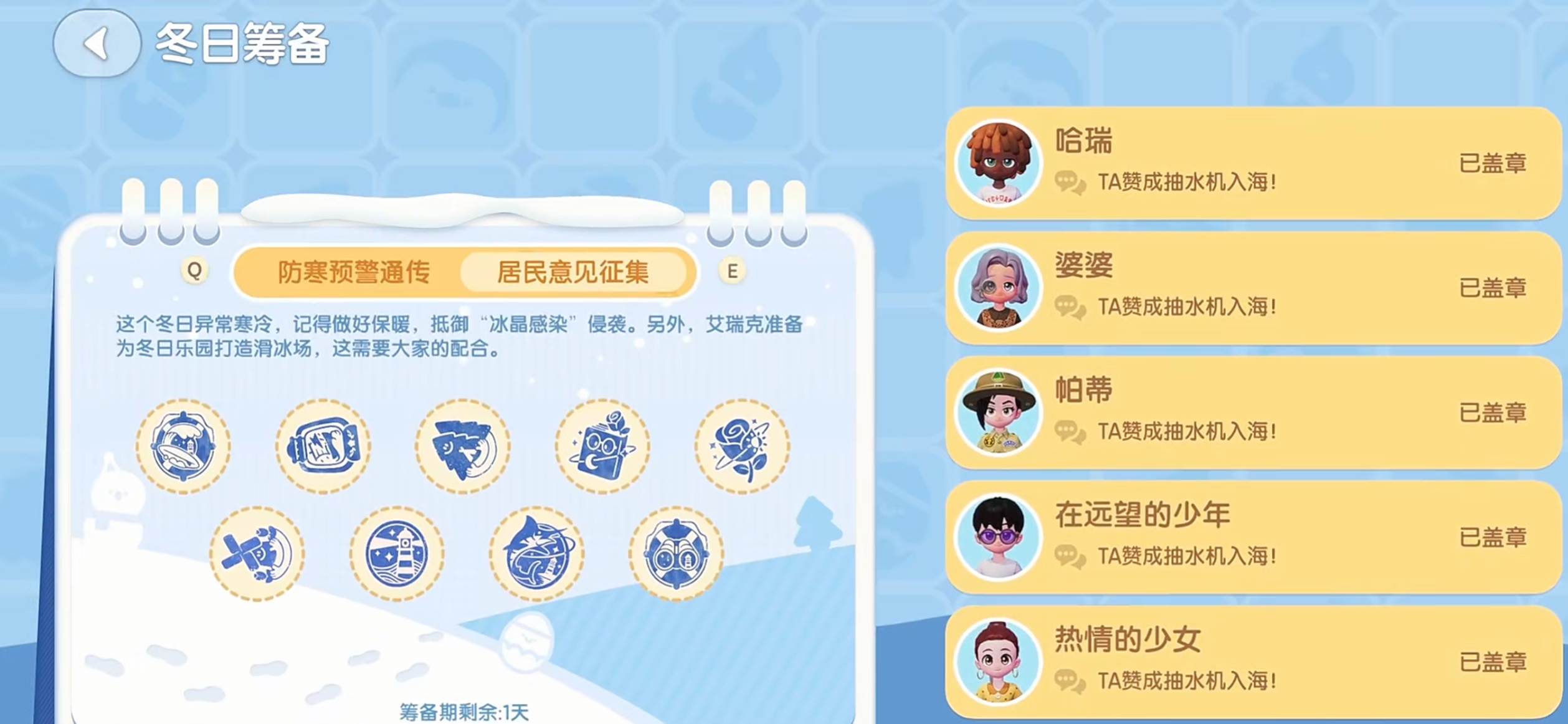 筹备期分两阶段,第一阶段是防寒预警通传,第二阶段是居民意见征集,奖励都挺实用,尤其是家具,摆家园里氛围感直接拉满。