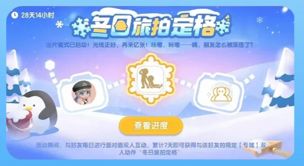 双人动作【冬日旅拍定格】,只要在冰雪季期间,和好友每天面对面互动一次,累计7天就能拿到。而且可以同时和多个好友打卡,进度是单独算的,赶紧找个固定搭子一起刷,不然等后期想找搭子就难了。