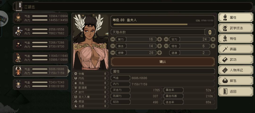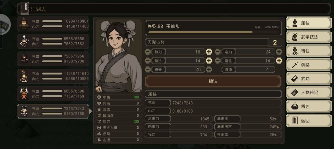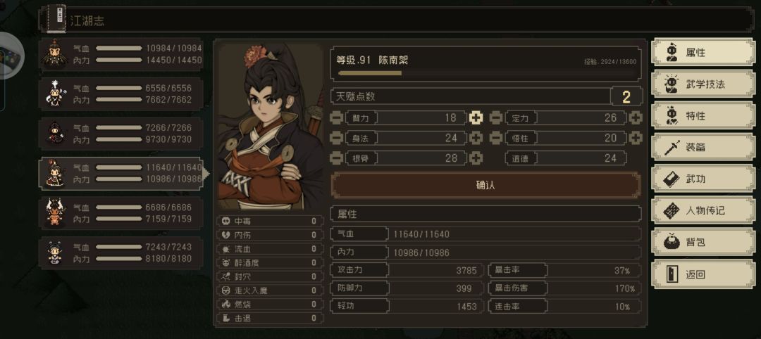 二周目选的贵公子,羽衣线主商参九剑(继成一周目左右穿花和商参九剑),商参九剑用的定力、奇门、防御、身法增伤。带五个妹子,夜妹主刀和暗器,阿夏太玄,南絮医疗辅助,盐夫人偷窃特殊,玉仙儿音律掌法。队伍现在培养起来打架都开自动就行了。