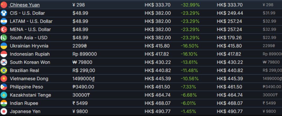 反观国区,各版本定价始终保持稳定,标准版298元,豪华版与顶级版均为498元,国区也因此成为该作当前的全球最低价区服。相较于美区标准版59.99美元、欧区标准版69.99欧元的定价,国区的价格优势十分明显,成为玩家预购这款游戏的最优选择。