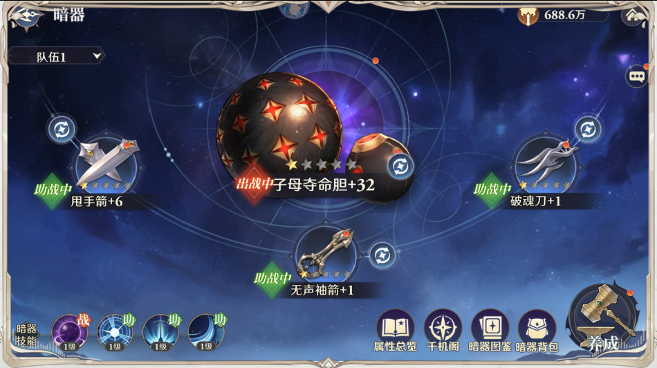 在魂师出战时,可通过配置暗器的方式为队伍提供助力,暗器在作战时可基于其技能自动发起攻击。暗器虽然是独立的养成系统,但也与我们队伍的整体战力息息相关(出战暗器、助战暗器都可有效提升战力,是后期提升战力的主要手段)。