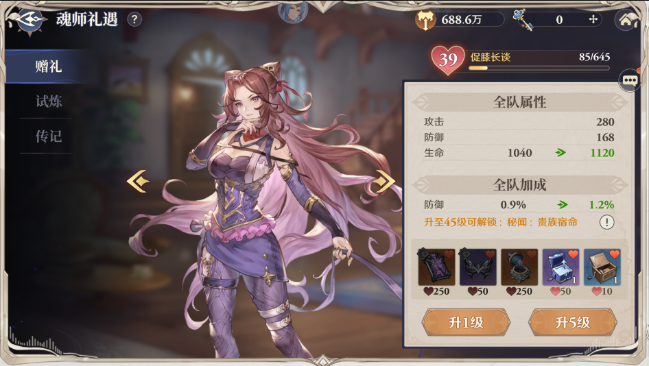魂师礼遇是属于“滴水穿石”类的养成系统,我们可通过赠送礼物来提升魂师好感度,每名魂师都可基于好感等级提供属性加成。单一魂师提供的属性加成稍低,但全部魂师好感度都提升后,属性加成是相当夸张的。赠礼可通过御堂、敏堂派遣、友情商店、黑市货铺、主线故事等渠道获取,赠礼短期战力提升有限,但长期养成可带来可观的收益。