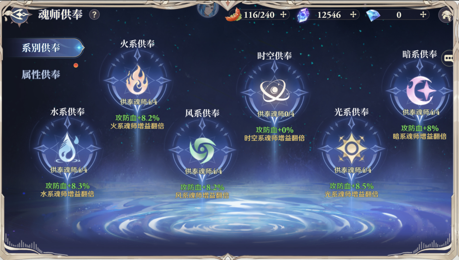 在魂师供奉殿中可供奉对应系别、属性的魂师,供奉殿可基于供奉魂师的品质、星级提供相应的加成。魂师供奉系统提供的战力加成也与我们的魂师养成进度相关,相当于我们在养成魂师的同时可通过两种渠道来进一步提升战力。魂师供奉、魂师档案册在中后期可提供大量的战力,大家可通过这两个渠道来与其他玩家拉开差距。