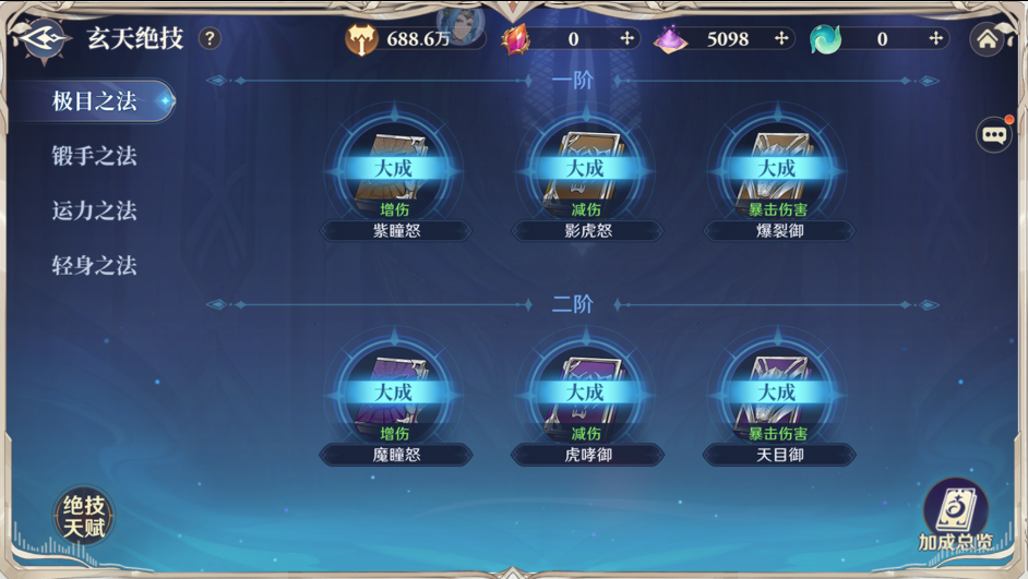 修炼玄天绝技可提升全体上阵魂师属性,初期的战力提升幅度特别大,建议优先养成。修习绝技需要消耗落日血晶,落日血晶可通过斗罗之路、联盟驻地、巨兽挑战、黑市货铺等渠道获取,玄天绝技是与其他玩家拉开差距的主要养成系统。