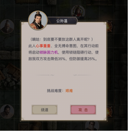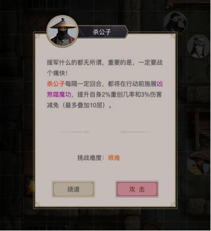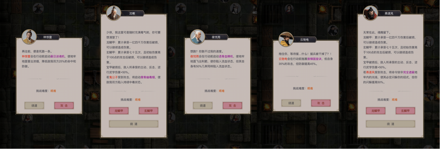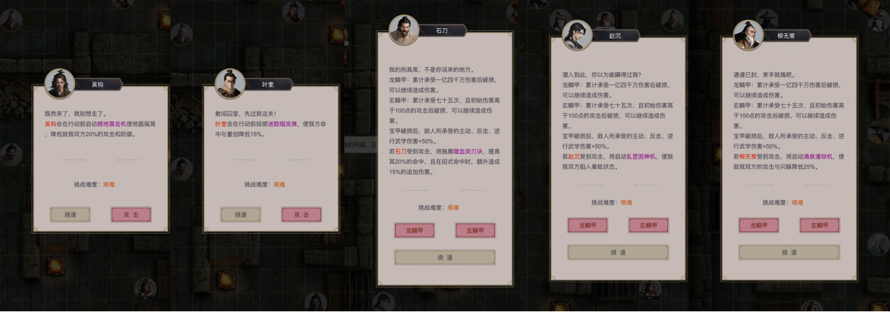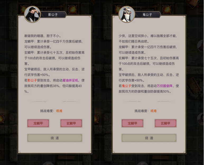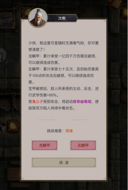 部分敌人有龙鳞甲和玄鳞甲的选择(同瓦岗寨),这里我选龙鳞甲造成一定数值伤害后获得buff。