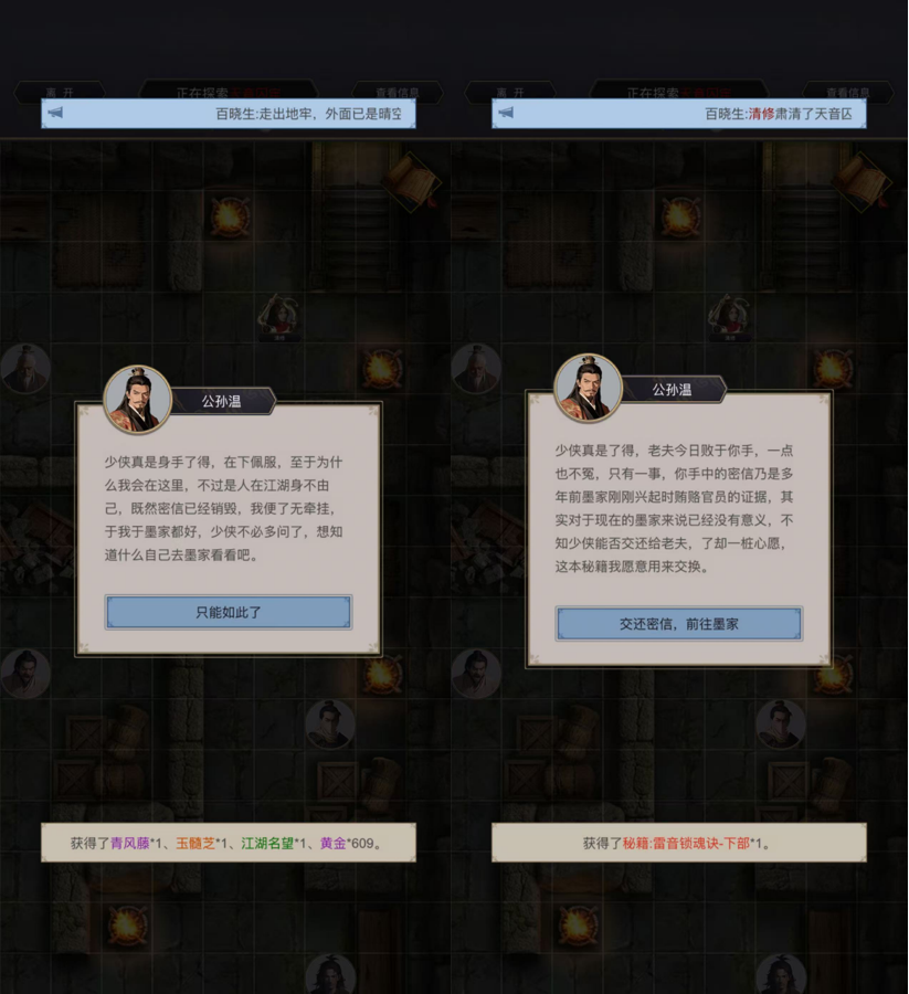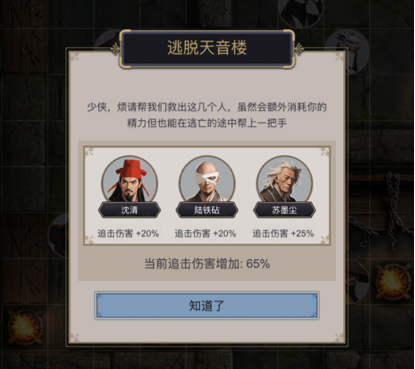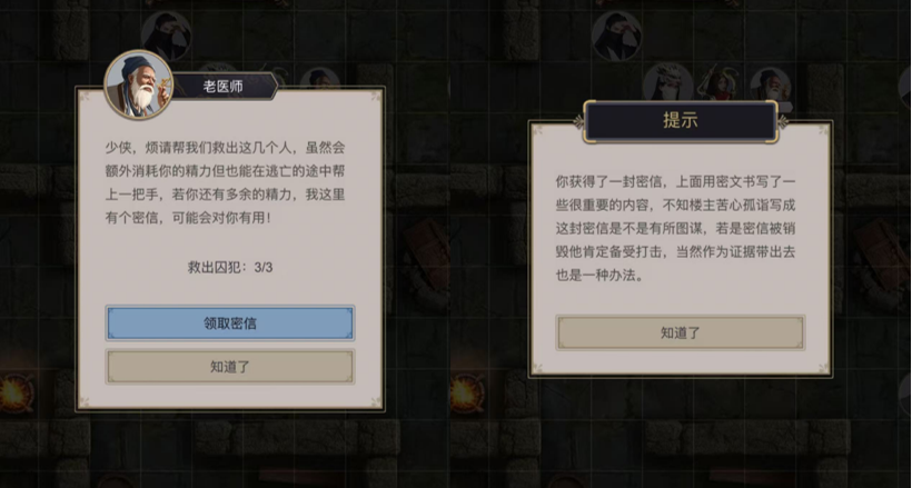 图中红框位置分别为弟子789号位和老医师,用阵法外置弟子击败3位守关小兵拯救囚犯便可在老医师处领取密信(和瓦岗寨一样,换汤不换药)。额外弟子只需要比瓦岗的三位强一些即可。每拯救一位囚犯可获得追击伤害增加(客服表示是极意武学战决的伤害)。