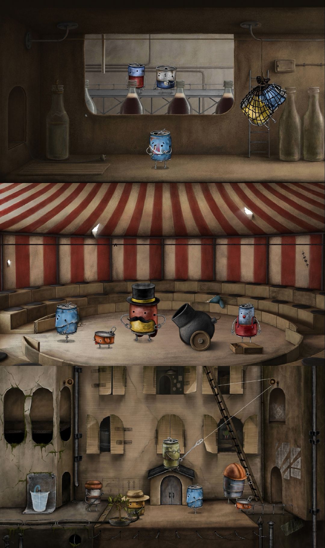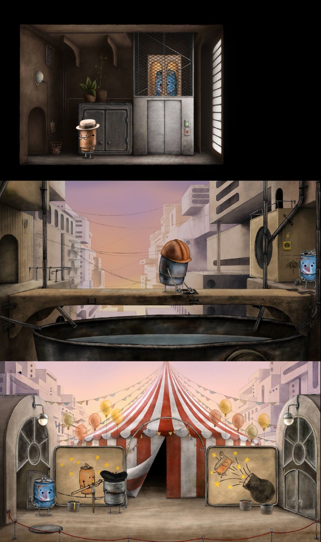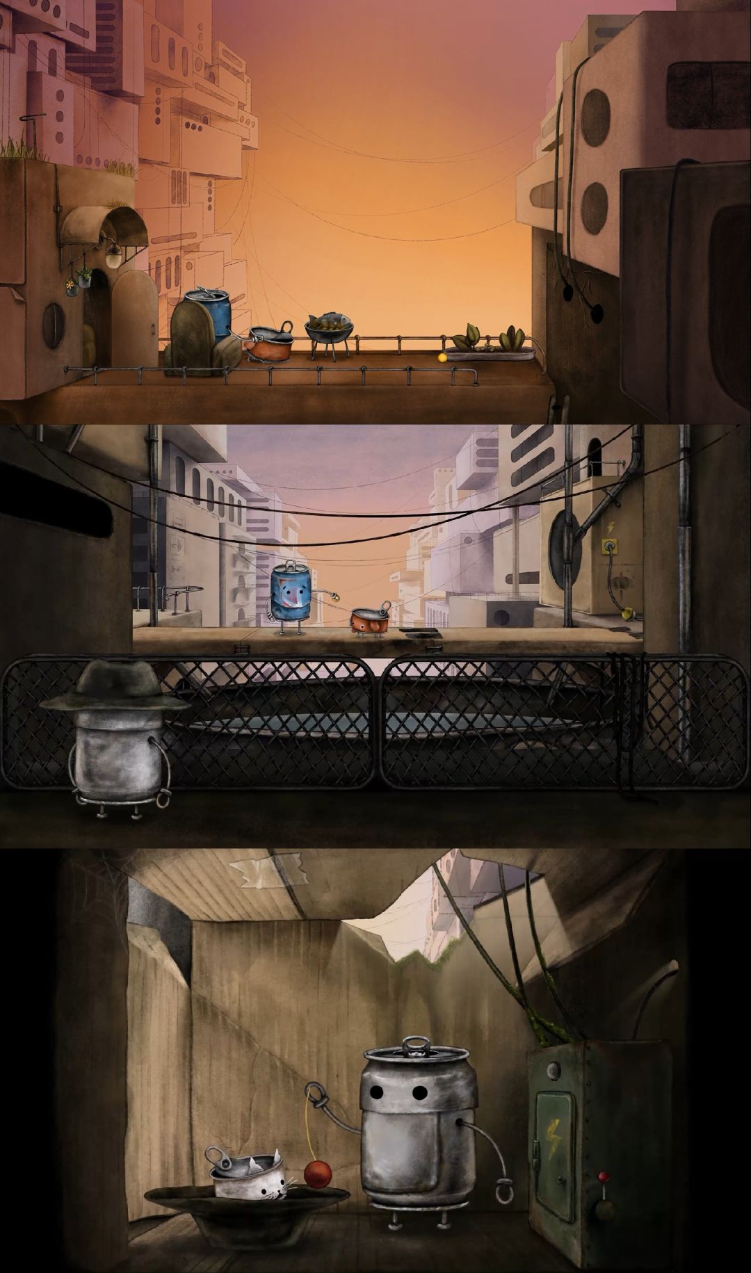 很有趣、可爱的解谜游戏。游戏以一个名为Blue Can的罐子为主角,它生活在一个满是旧罐头盒子的城市。在一次地震后,它的罐子狗狗失踪了,自此它便循着踪迹踏上了寻找之路。这一路上,它遇到很多罐子同类,一步步解开谜题,帮助它们,同时也在它们的指引下,找到罐子狗狗,用3枚金币从意图将其当作炮弹发射的恶霸罐子手中赎出,最终回到它们的小家。