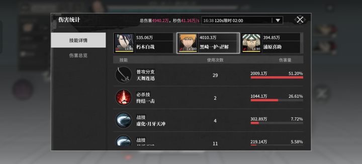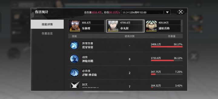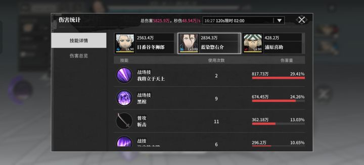 如图120s,3+2+2店长,0+1+1市丸银,0+1+2东仙要,1+1+3蓝染,1+1+3一户,0+1+1小白,同样手法下,市丸银的突队伤害已经跟蓝染小白灵队伤害持平了,而且出伤稳定,不需要什么手法
