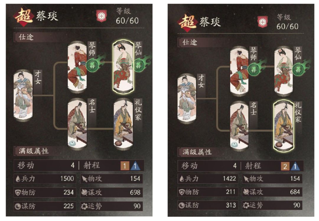 与游戏内推荐一致,蔡琰推荐单走琴仙路线上精通十二,考虑到需要在敌人一定范围内施放「悲歌愁」,对硬度有一定要求,且己方获得护盾量与其谋攻数值有关,更高的谋攻能提供更多护盾量。礼仪家路线仅精通四交龙骧之印*1拿「悲歌愁」。