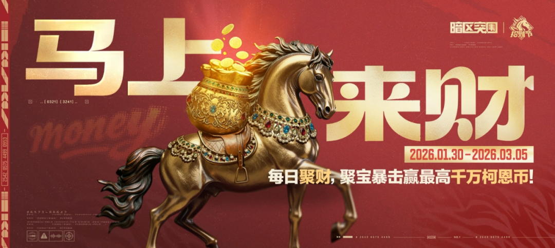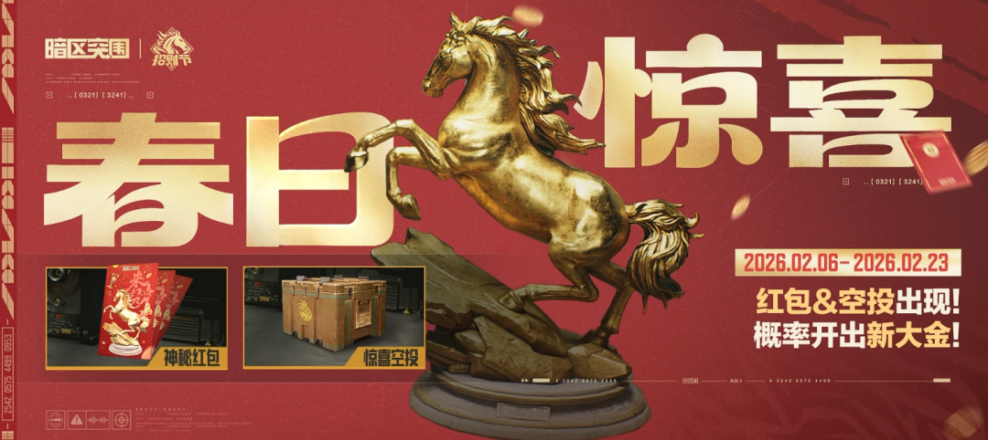 金驹跃岭雕像出没!活动期间局内概率出现惊喜空投和贺岁红包,开启后几率获得马年新大金【金驹跃岭雕像】!