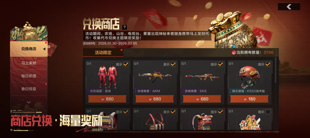 主题限定装扮等你来拿!使用代币即可兑换【赤色福星·套装】【赤啸乘黄·AKM】【赤啸乘黄·SKS】等奖励!