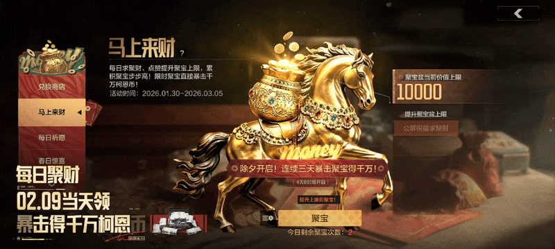 活动期间,每日聚财、点赞提升聚宝上限,2月9日登录暴击聚宝,最高可得千万柯恩币!