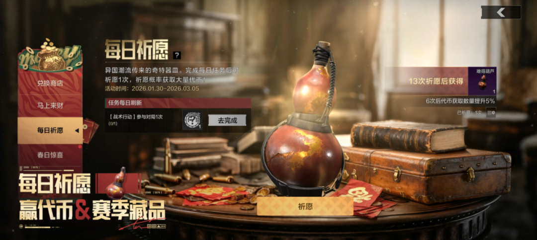 完成每日任务后即可祈愿一次,概率获取大量代币!达到祈愿次数要求,还可获得赛季藏品【难得葫芦】!