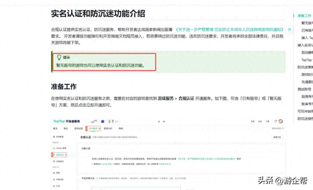 什么意思呢? 也就说,虽然研发没有版号,但是可以上线taptap接入防沉迷系统,就是产品授权给taptap,使用的是taptap公司和中宣部接入的实名认证系统。所以taptap可以合法合规的帮助研发提供上线内侧,但是游戏不能收费。暂不配置中宣部参数。二:无版号能在中宣部网络游戏防沉迷实名认证系统吗? 不能!在中宣部网络游戏防沉迷实名认证系统完成应用的注册,必须有游戏版号,注册后还需要完成中宣部「接口测试」并且游戏需要通过中宣部的审核。有的朋友可能会问?为什么taptap可以让第三方的接入实名认证系统,可以理解为taptap让第三方使用的是自己平台的实名制系统,