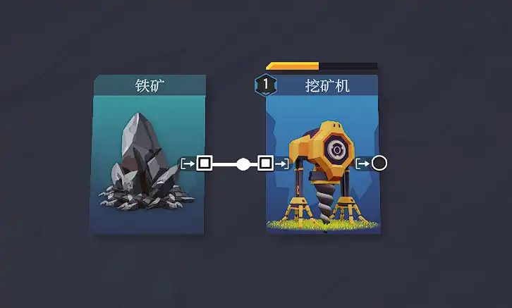 虽然名字叫卡牌工厂,但它并非是一款卡牌类游戏,,而是重点突出后面的“工厂”部分。初期玩家会获得一张铁矿牌和一张挖矿机牌,这些卡牌身上至少都会带有一个“圆形节点”。像铁矿牌拥有一个输出点,挖矿机则是拥有一个接入点和一个输出点。此时就需要玩家通过鼠标拖动它们的接入点来进行链接,之后挖矿机就会一直在那边挖矿,而它的输出点则会输出它挖出来的矿物——铁矿石。