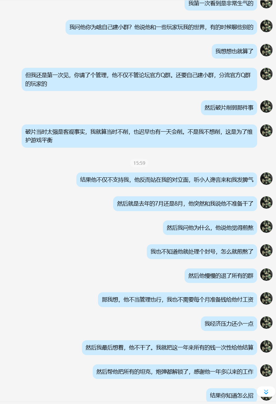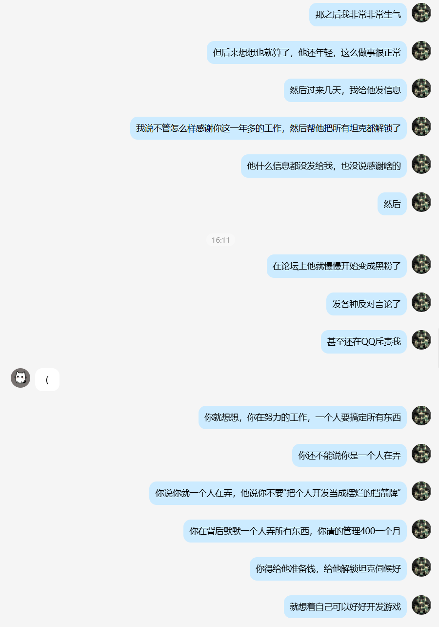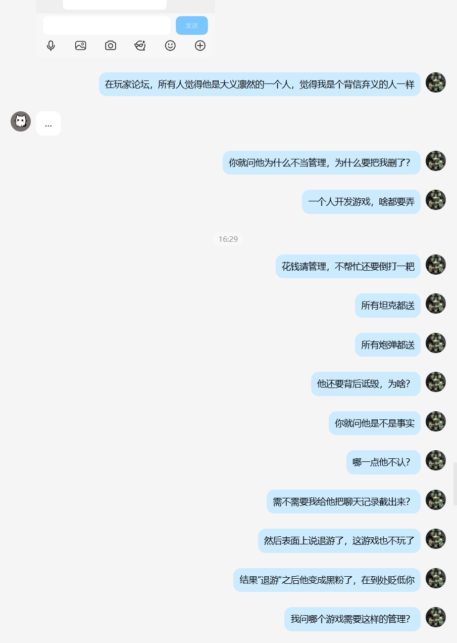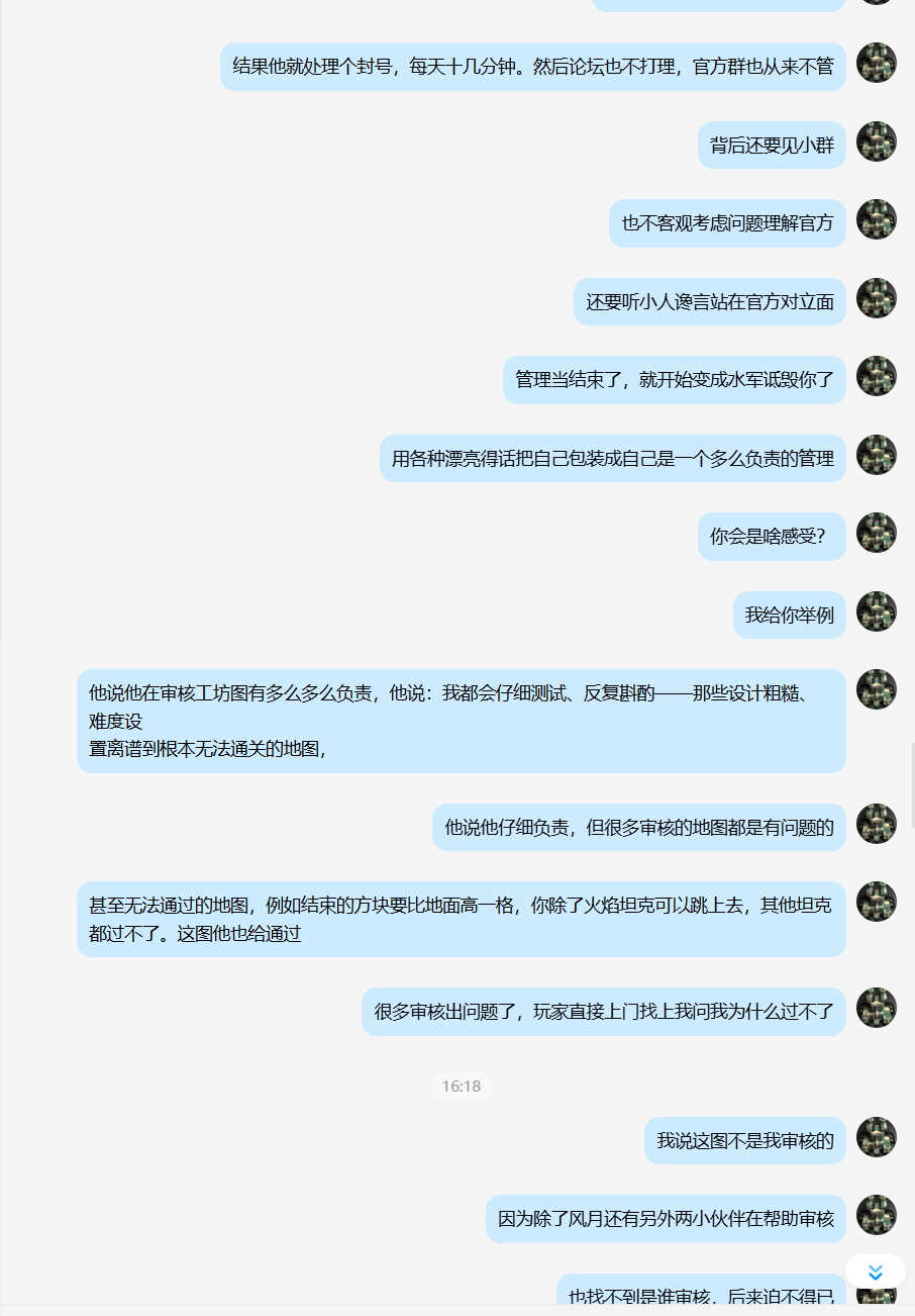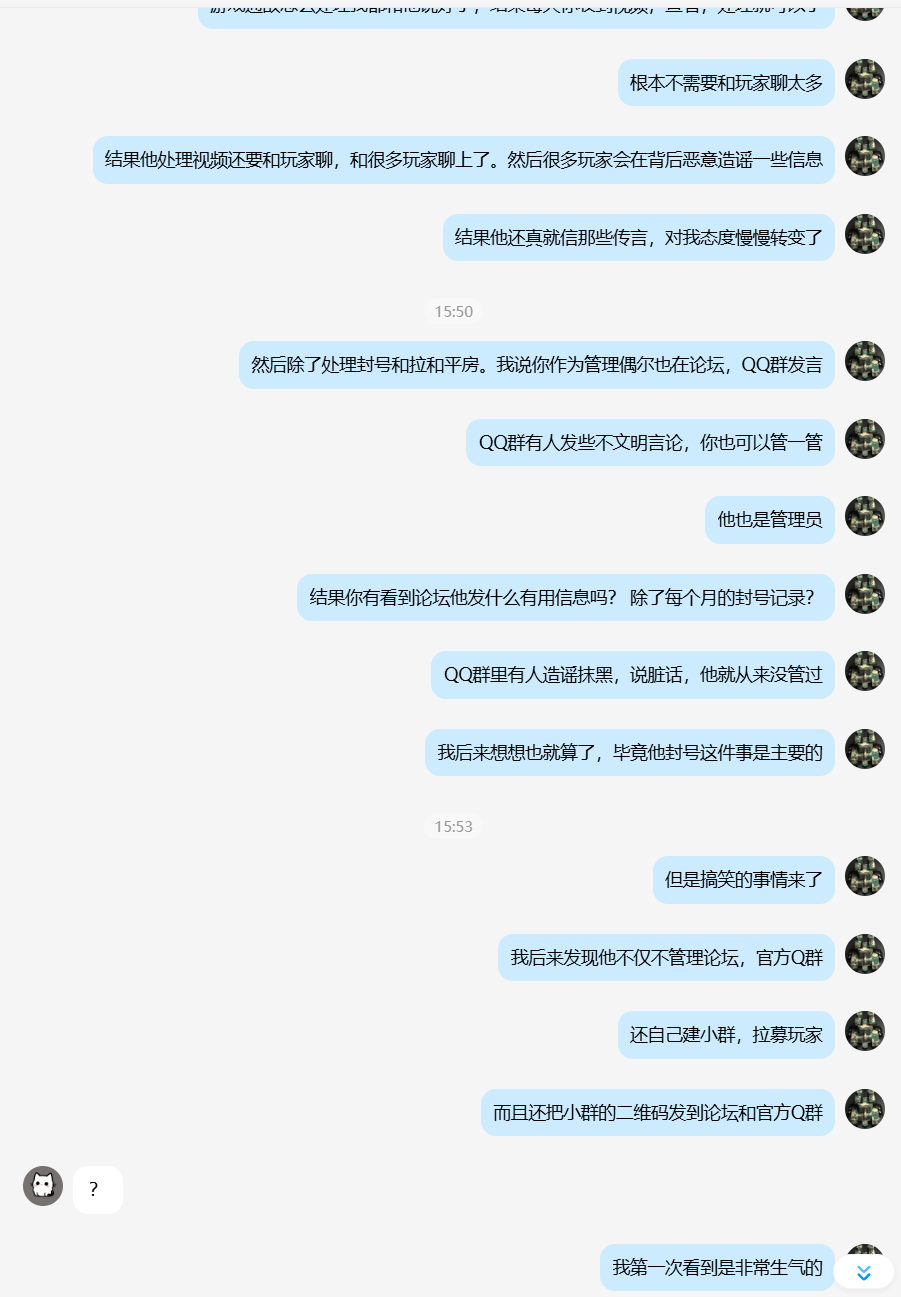 我本来只想默默地开发游戏,但是论坛一直以来被各路玩家误解,甚至被一些极端得玩家辱骂,抹黑。我原本也不想把这些事公之于众地,觉得就是一小撮人,冷静一段时间就没事了,但现在实在忍无可忍了。你默不作声,别有用心地人就会变本加厉地抹黑造谣,更多的人会以为你就是别人口中的那样。既然风月选择不分对错,倒打一耙。那这次我就把事情公之于众,让大家看清楚水墨风月是如何当一个”认真负责“的游戏管理的。