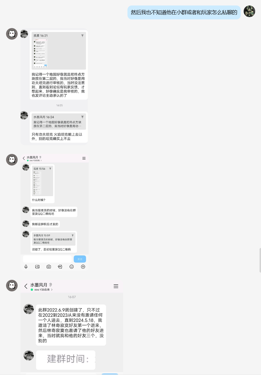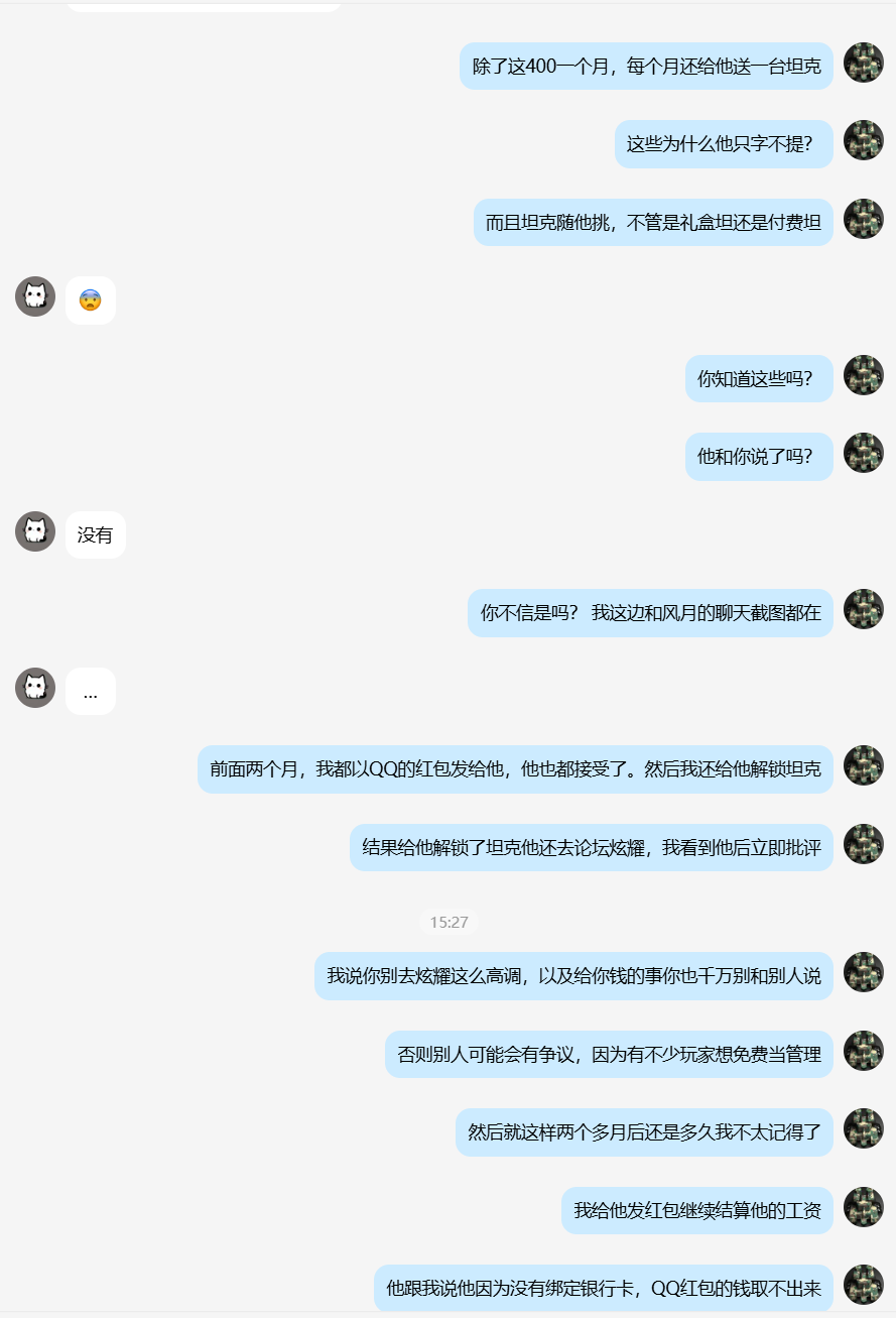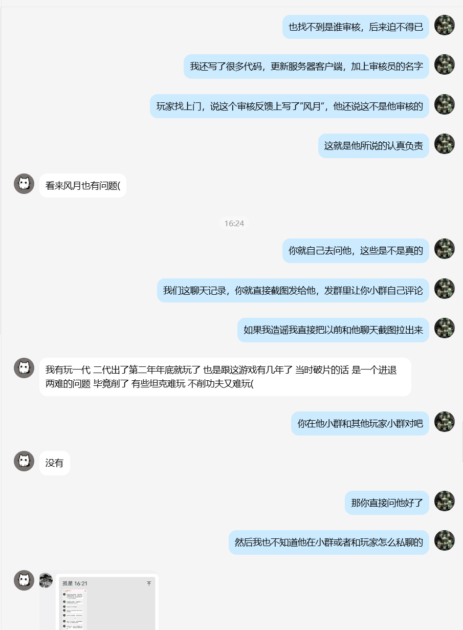 以下是我和某位玩家的聊天记录,最后附上我和风月的QQ聊天记录,所有聊天记录都在。如果你选择不信,你觉得我是在造谣,觉得图片是我P的,你可以自己去问水墨风月要聊天记录!