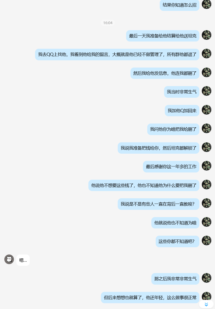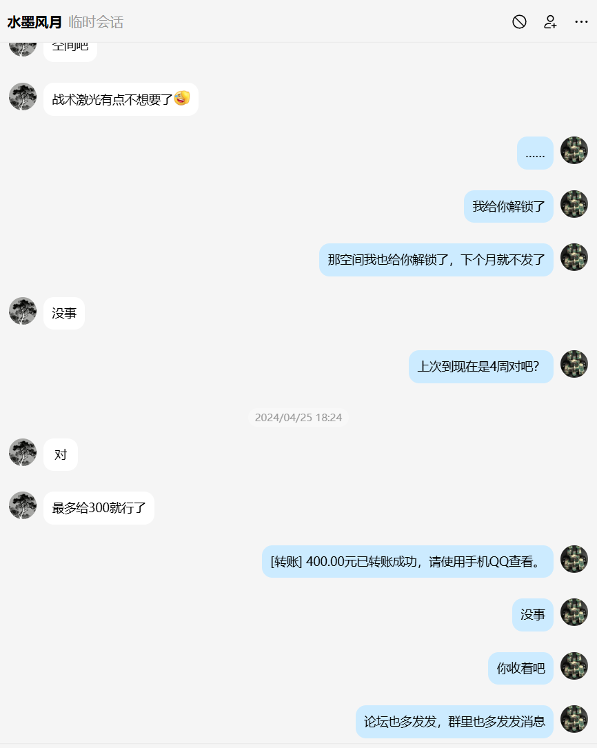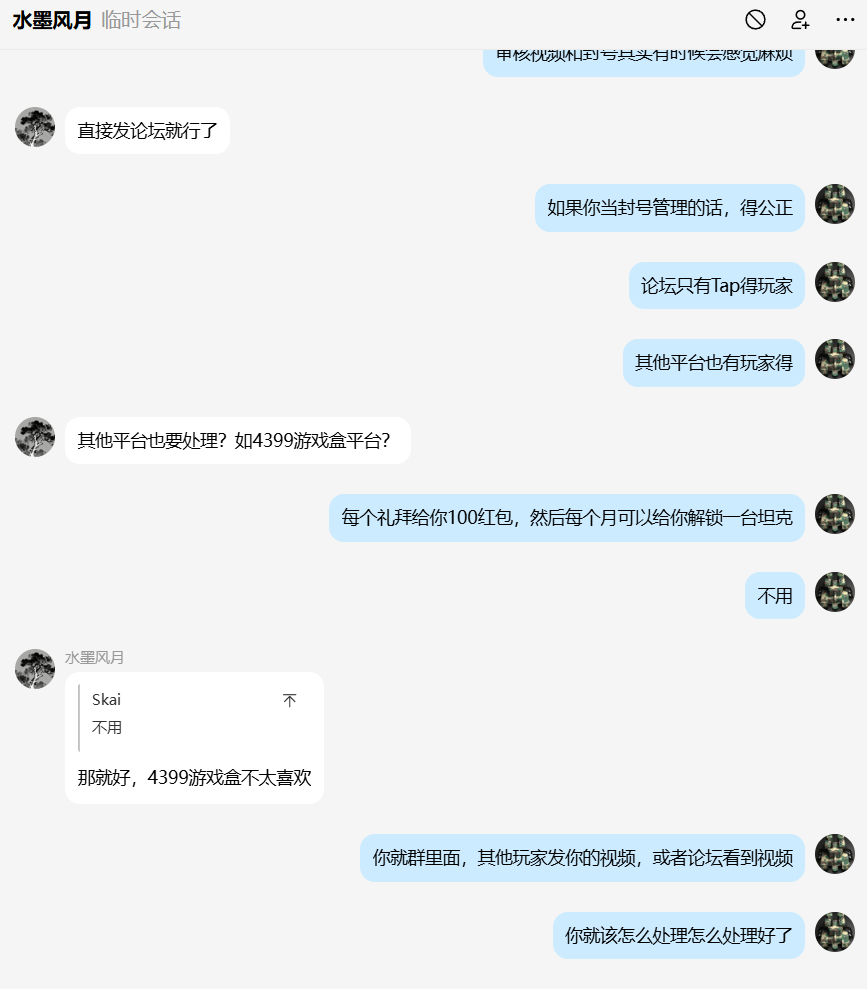 以下是我和某位玩家的聊天记录,最后附上我和风月的QQ聊天记录,所有聊天记录都在。如果你选择不信,你觉得我是在造谣,觉得图片是我P的,你可以自己去问水墨风月要聊天记录!