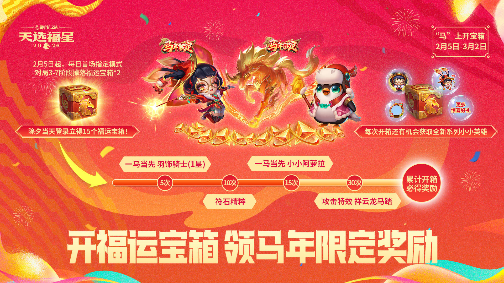 🎉累计开箱即可免费领取马年限定小小英雄【一马当先 小小阿萝拉】(除夕登录立领)和马年限定【祥云龙马踏】攻击特效,还有机会获得全新系列小小英雄!