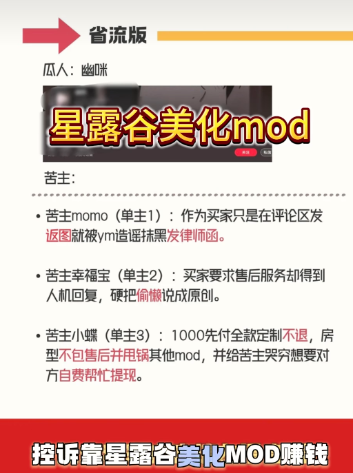 后面还有买家反馈幽咪的模组存在 “四条胳膊”“僵尸农夫” 等明显BUG后,不仅被她推诿敷衍、拒绝修复,还被认定诽谤并收到律师函,幽咪还将模组BUG的责任,甩锅给了无偿分享代码的其他MOD作者。