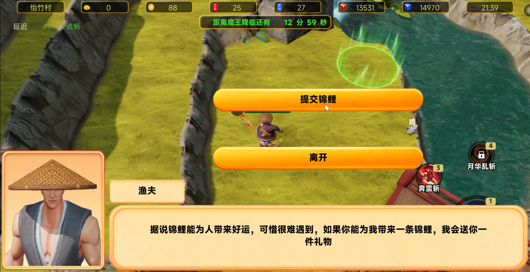 渔夫事件:渔夫正在寻找一尾锦鲤,希望可以给自己带来好运,钓鱼有几率获取锦鲤,提交锦鲤后可获取稀有装备龙泉剑