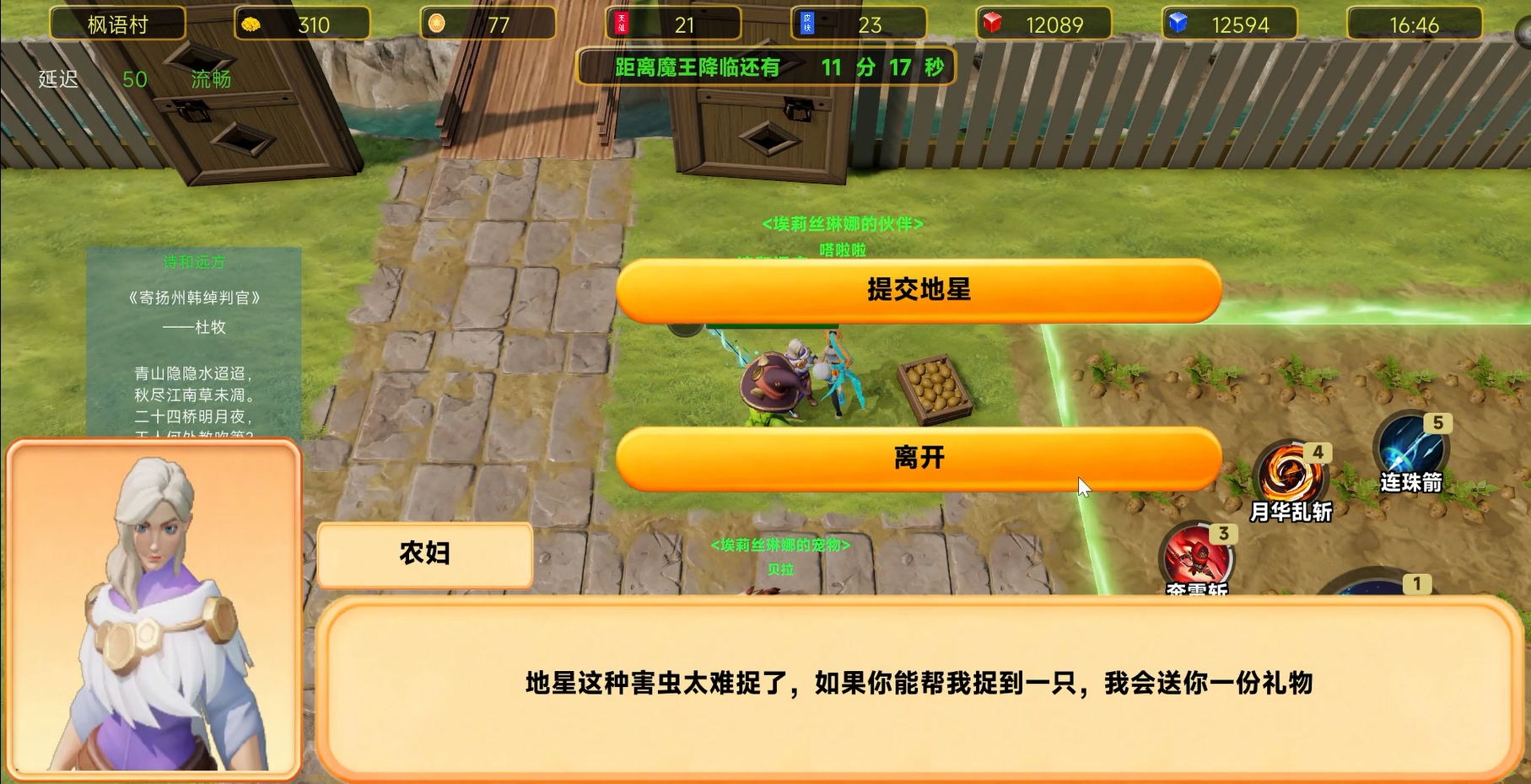 农妇事件:农妇的农田遭到了害虫入侵,其中以地星危害最大、最难捉,在农田捉到地星后交给农妇可以换取农妇的神秘罐子,有几率开出史诗装备生命女神的挂坠,地星总数量每次可能不一样,整体在2-4只之间随机