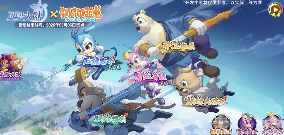 《西普大陆》正式开启了与经典童年武侠IP虹猫蓝兔的联动,从1月23日版本更新后联动活动持续至3月6日结束,蓝兔、莎丽、逗逗等六位经典角色化身联动精灵登场,唤醒玩家的童年武侠回忆。