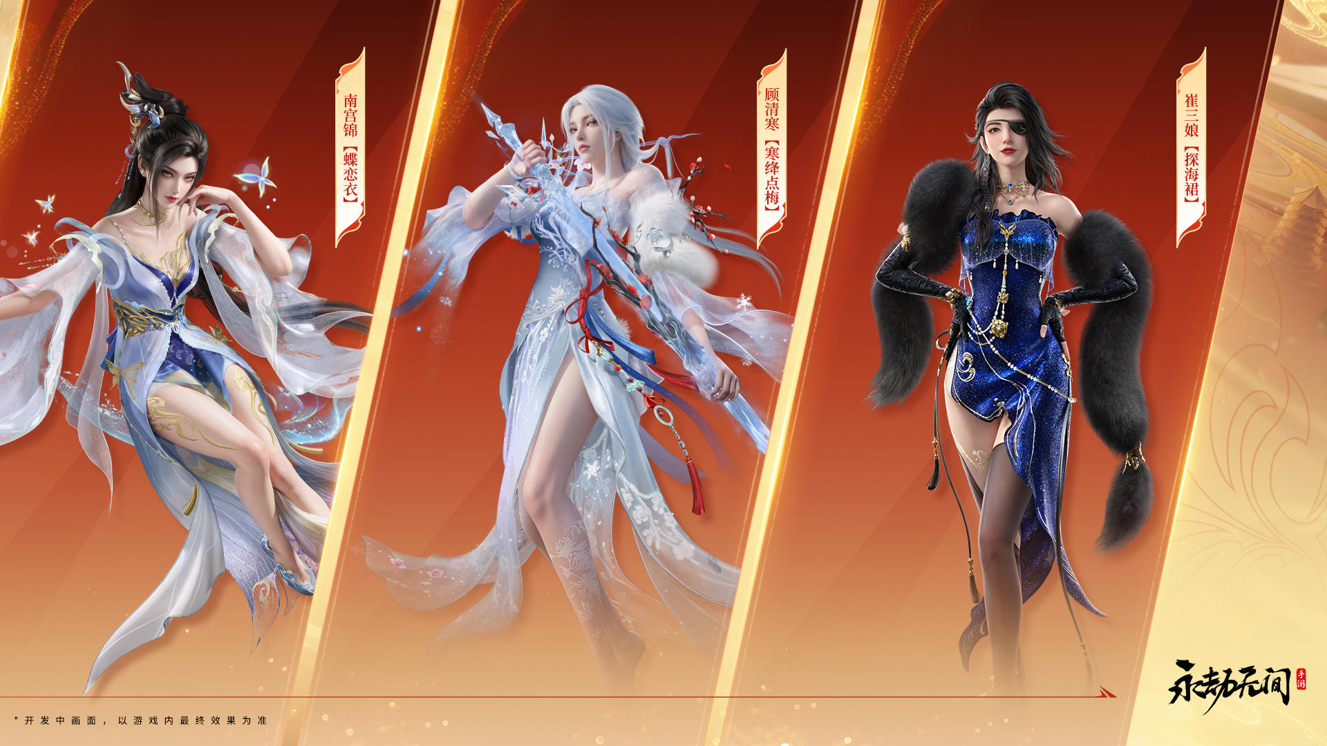 顾清寒【寒绛点梅】,素衣白纱上寒梅影绰;南宫锦【蝶恋衣】,薄纱上鎏金错彩,蝶影翩跹。此外,英雄们期待的崔三娘【探海裙】也将加入神佑宝灯。
