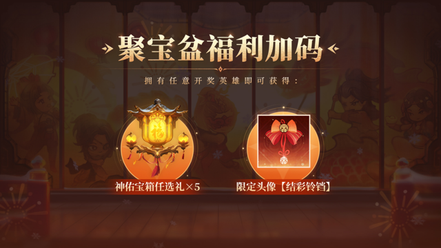 在永劫顶刮刮小程序中凡是刮到聚宝盆或选中岳山为幸运英雄的玩家,都可获得【神佑宝箱任选礼】*5和限定头像【结彩铃铛】!你选对了吗?