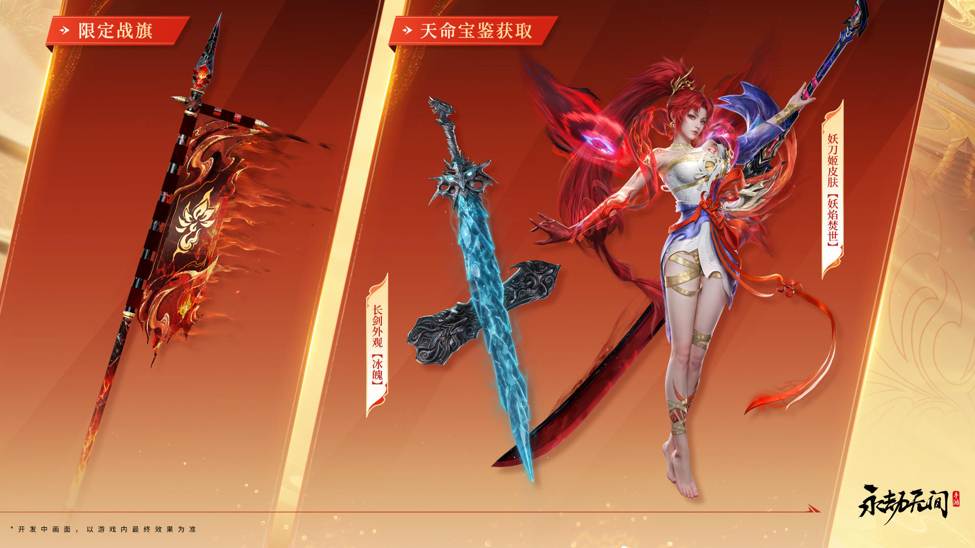 【天命宝鉴】内的妖刀姬神品时装【妖焰焚世】和长剑神品皮肤【冰魄】等精美外观已为囊中之物,快来和它们抱个满怀!另外,开启【聚宝宝莲】更有机会获得专属战旗皮肤哦~