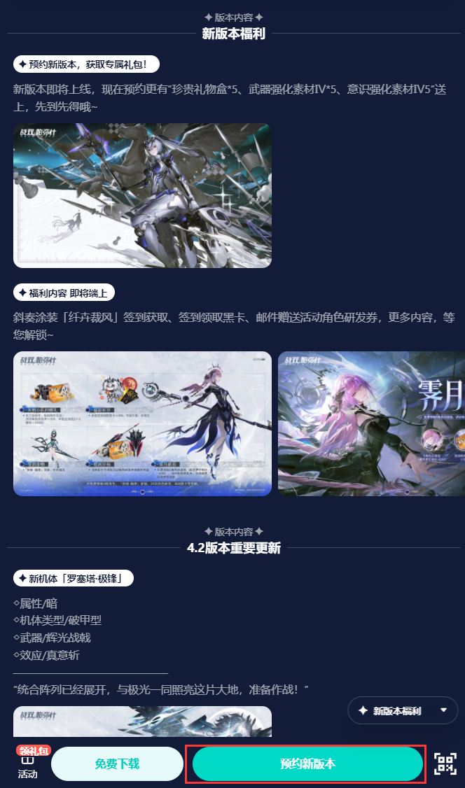 二:点击预约在“预约新版本”界面中,点击右下角的【预约新版本】按钮,就完成预约啦~同时,在该界面中,指挥官还可以查阅已经整理好的版本资讯,第一时间了解到新版本的更新大纲。