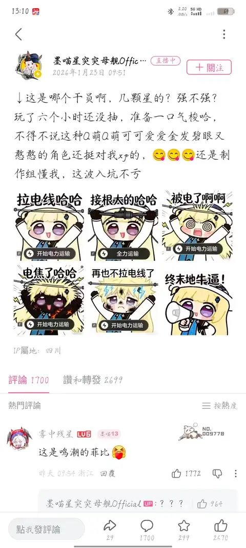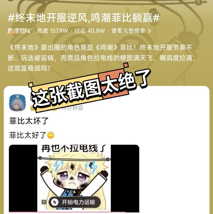 大致了解了事情经过,事情是这样的。终末地开服后,因为一些有的没的问题这里就省流快进掉了,社区氛围比较紧张。就在这时,一组“菲比拉电线”的魔性表情包开始刷屏。