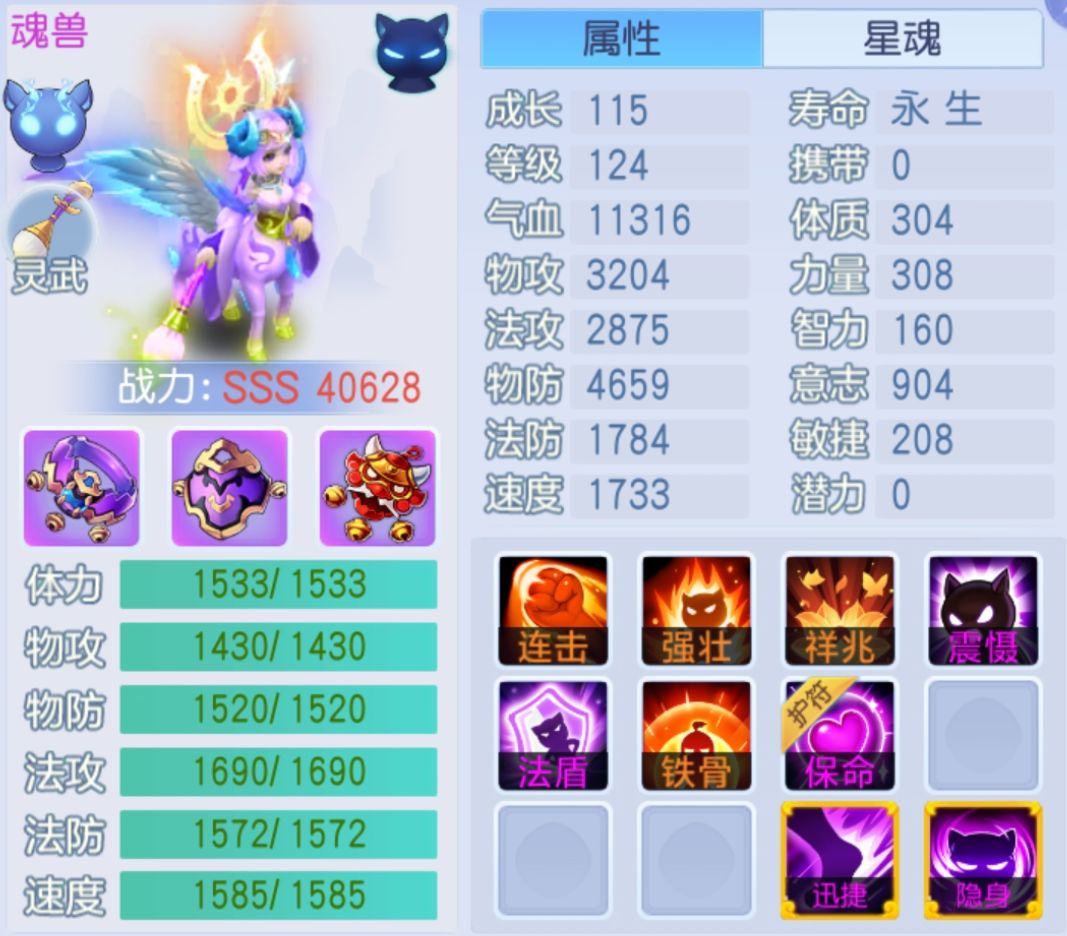 星魂套法术减伤补法防不足,物理减伤增益。属性气血为主,速度物防为辅,建议全生存追求极致生存。星魂品质低,青蛇紫品,升橙后更强。