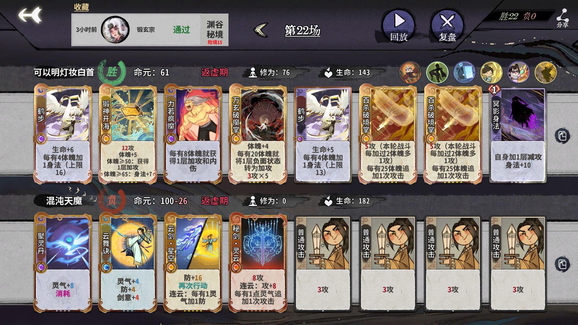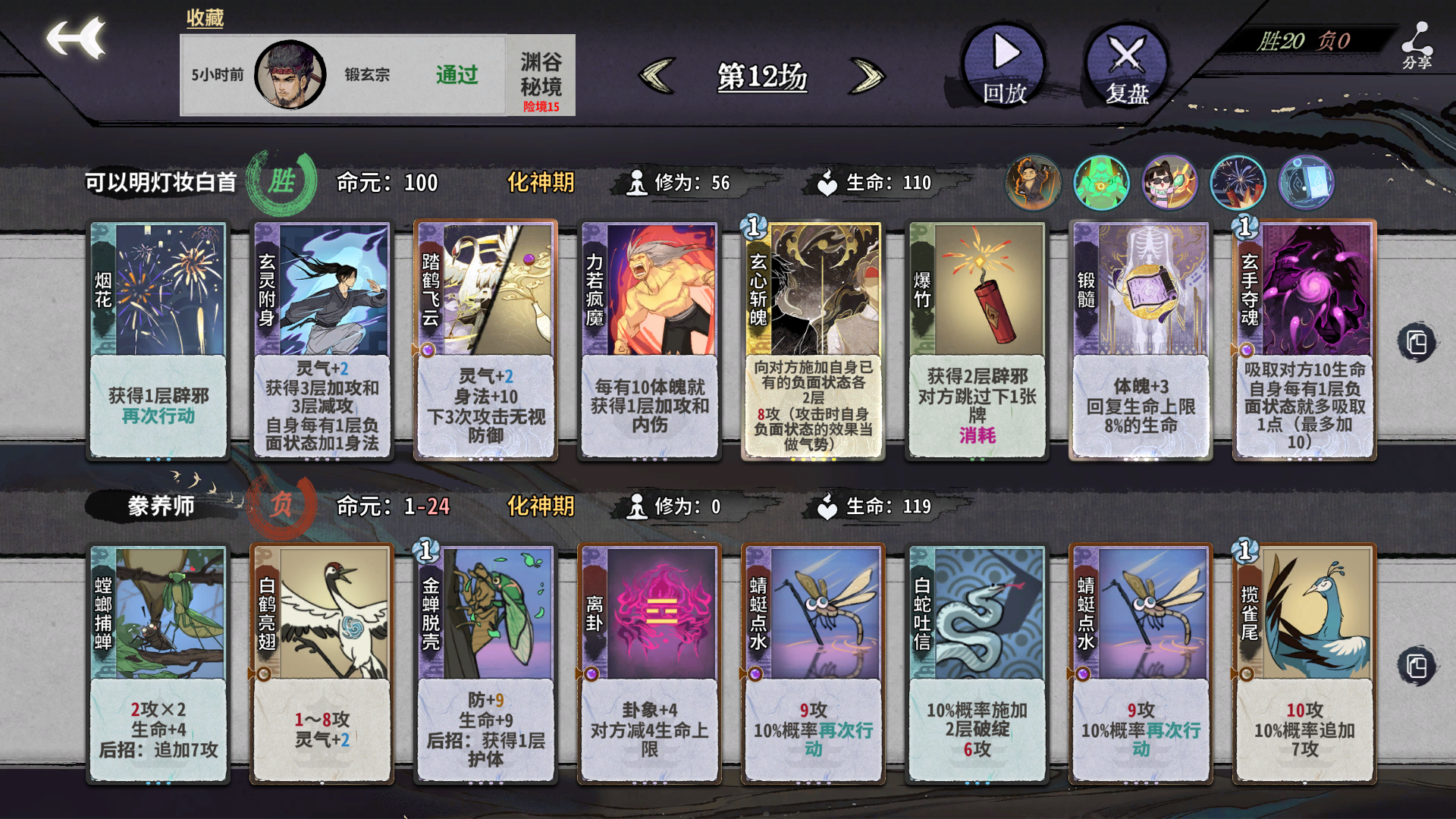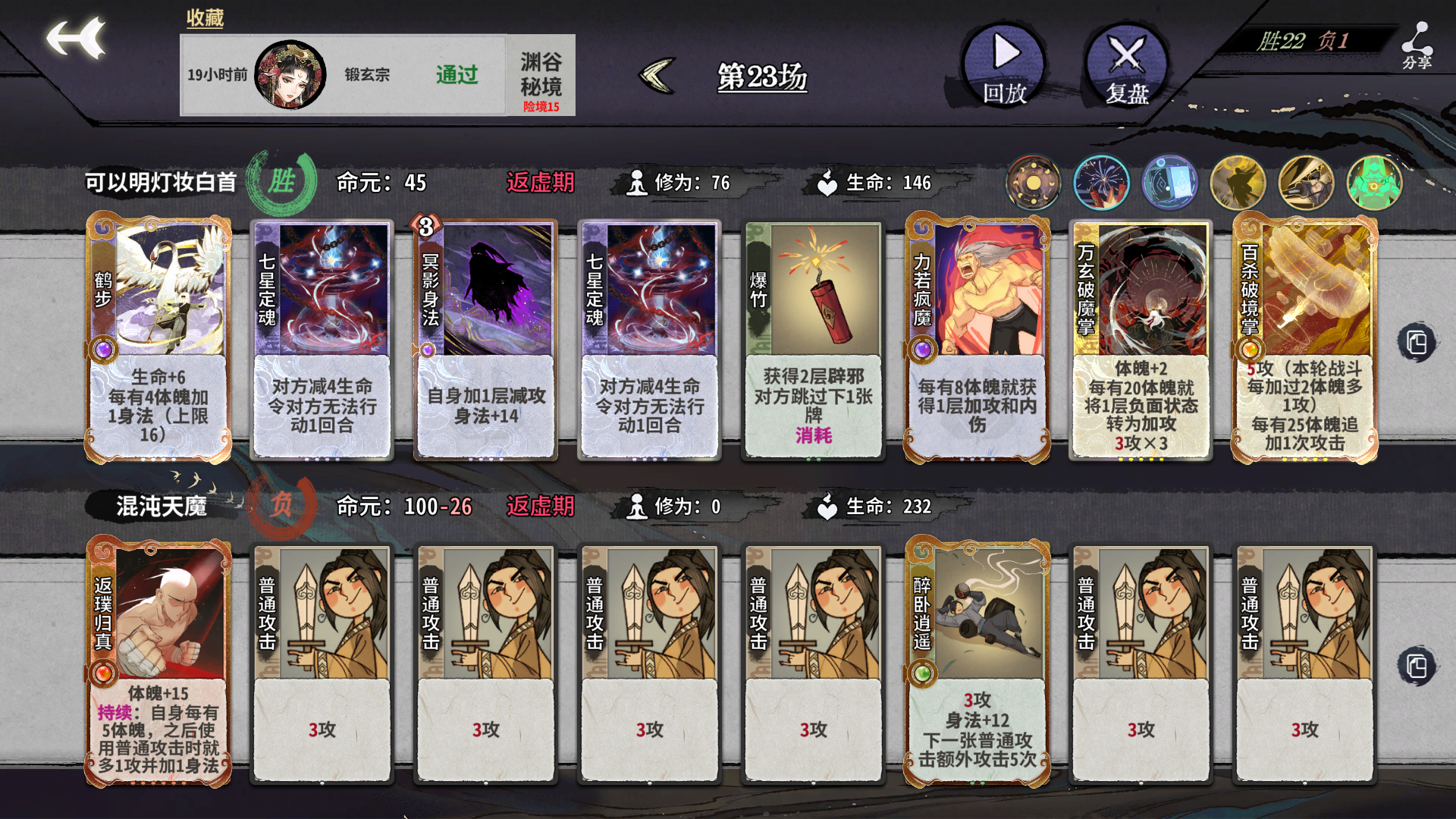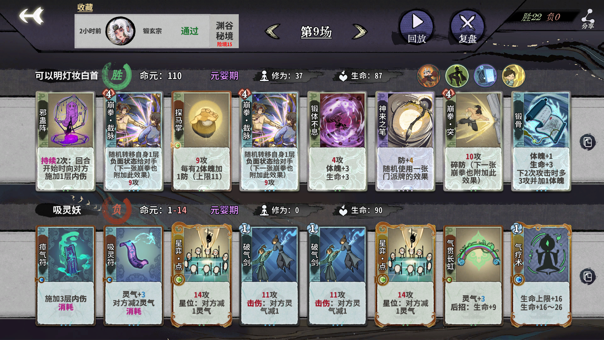 李㵘的先天仙命使得我们能够快速补体魄,故同样在前期不着急锻体,以赢为主,能赢再锻。但是不点化神仙命灵气会自动转为体魄,在金丹元婴期我们可以选择的卡组反而较少,只能尽量以崩拳、迎风等卡组进行过渡了。